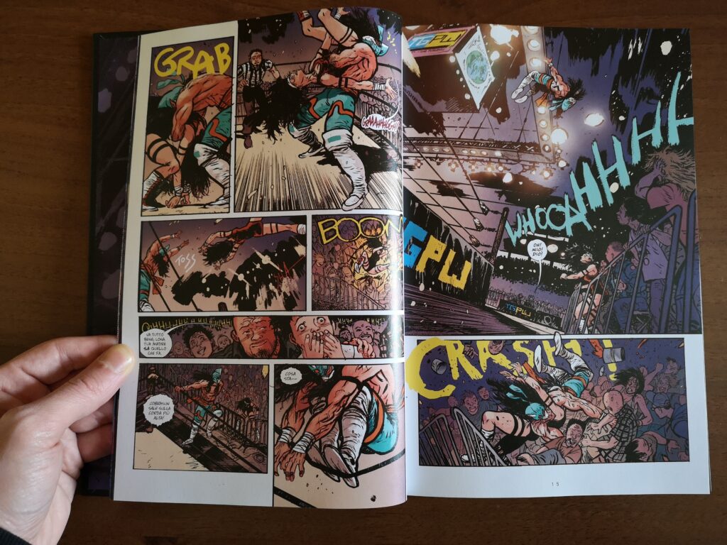 Daniel Warren Johnson è l’autore unico e completo di Do a powerbomb. Il suo tratto è dinamico e potente, fortemente influenzato dall’animazione giapponese e dai manga. Questo lo si può notare nell’utilizzo delle linee cinetiche che donano grande vigore a ogni scena d’azione. La passione e la conoscenza che dimostra riguardo al mondo del wrestling è immensa, infatti, molti appassionati sapranno riconoscere alcune delle mosse iconiche di alcuni atleti. I dialoghi sono ottimi, così come un paio di colpi di scena in grado di spiazzare completamente il lettore.