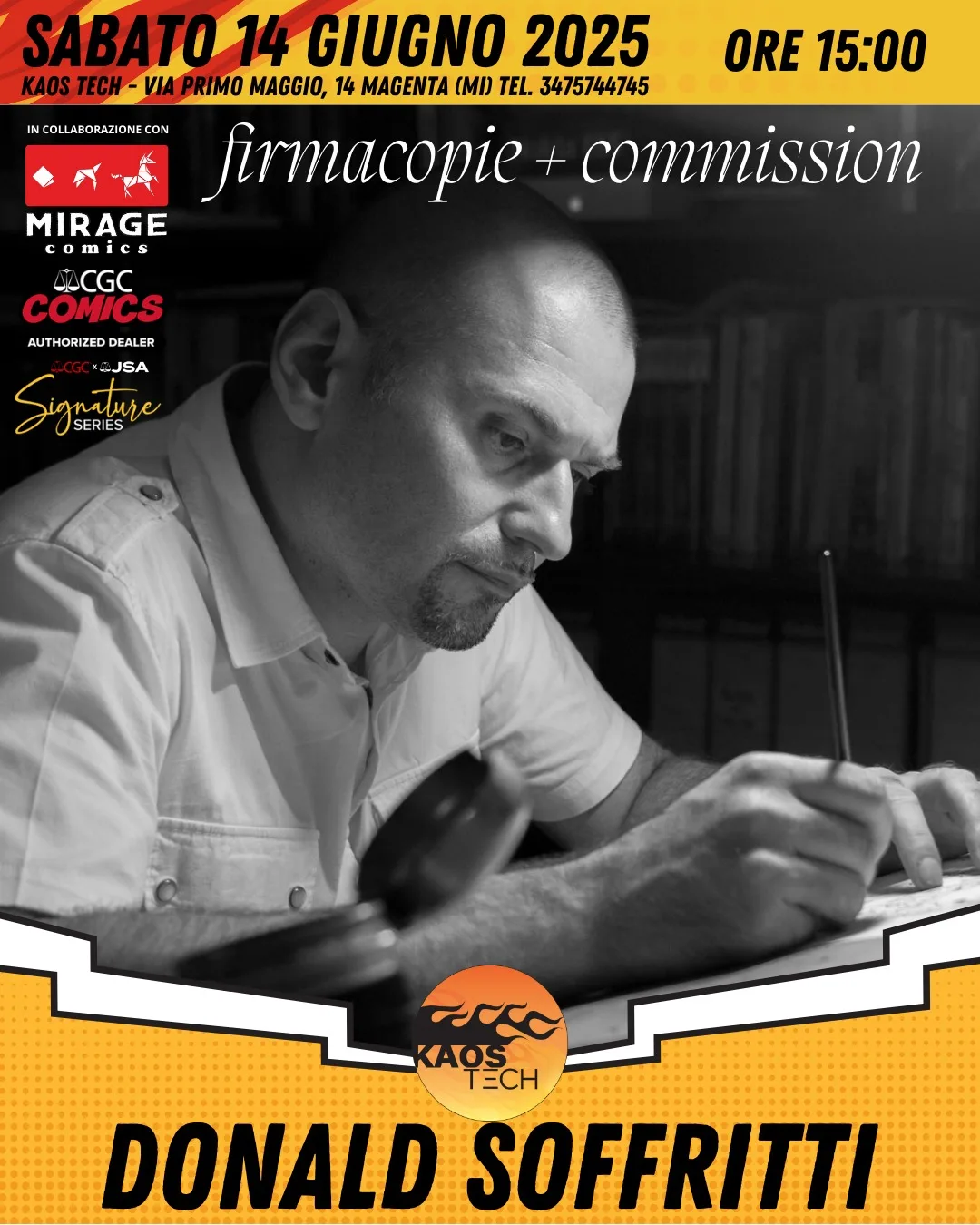Sabato 14 giugno 2025, a partire dalle ore 15:00, lo store Kaos Tech di Via Primo Maggio 14, Magenta (MI) ospiterà un evento esclusivo con la partecipazione straordinaria del fumettista Donald Soffritti.