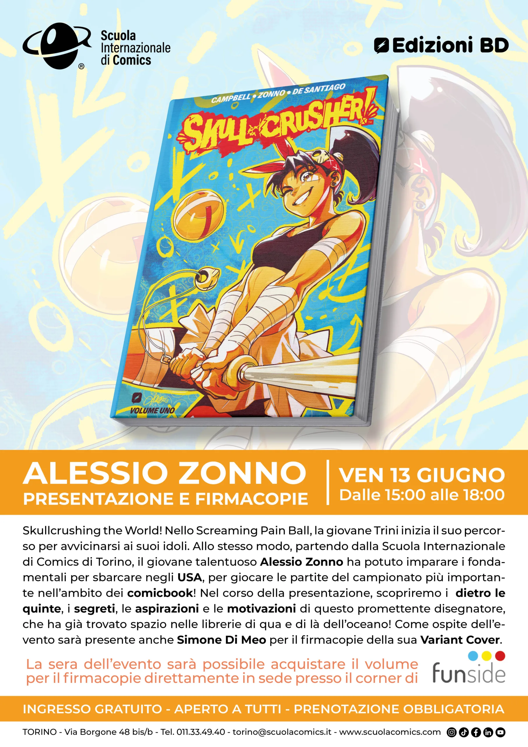 Si parte alle 15,00 con SKULL CRUSHER! Nello Screaming Pain Ball, la giovane Trini inizia il suo percorso per avvicinarsi ai suoi idoli. Allo stesso modo, partendo dalla Scuola Internazionale di Comics di Torino, il giovane talentuoso Alessio Zonno ha potuto imparare i fondamentali per sbarcare negli USA, per giocare le partite del campionato più importante nell’ambito dei comicbook. Nel corso della presentazione, sarà possibile scoprire i dietro le quinte, i segreti, le aspirazioni e le motivazioni di questo promettente disegnatore, che ha già trovato spazio nelle librerie di mezzo mondo. Come ospite dell’evento sarà presente anche Simone Di Meo per il firmacopie della sua Variant Cover. La sera dell’evento sarà possibile acquistare il volume per il firmacopie direttamente in sede presso il corner di Funside.