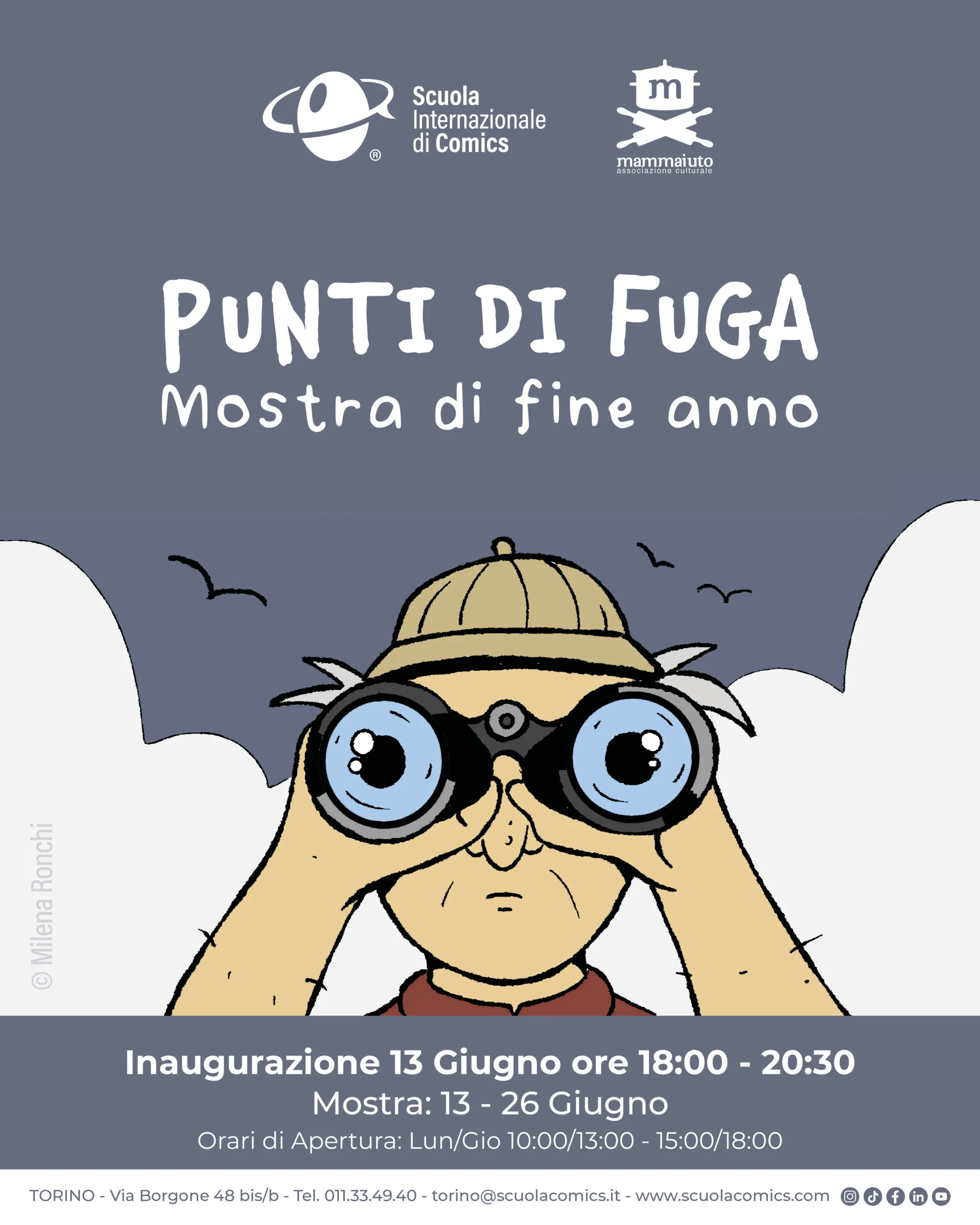 Dalle ore 18, inaugura la mostra PUNTI DI FUGA. Grazie alla collaborazione con il collettivo Mammaiuto e al coordinamento del fumettista e sceneggiatore Lorenzo Palloni, le classi dei terzi anni di fumetto riempiranno le pareti della Scuola per dare vita, con il loro progetto di autoproduzione, ad una mostra fuori dall’ordinario. Un viaggio, con gli occhi rivolti verso nuovi orizzonti, dove la sperimentazione e la creatività sviluppano punti di vista sorprendenti. Durante la serata sarà possibile ammirare dal vivo una selezione delle tavole realizzate durante il progetto e sfogliare tutte le autoproduzioni. Ad arricchire la serata, un’esperienza laboratoriale di serigrafia, musica e un servizio di food truck per brindare alla fine delle lezioni e salutarci con un grande arrivederci al prossimo anno.