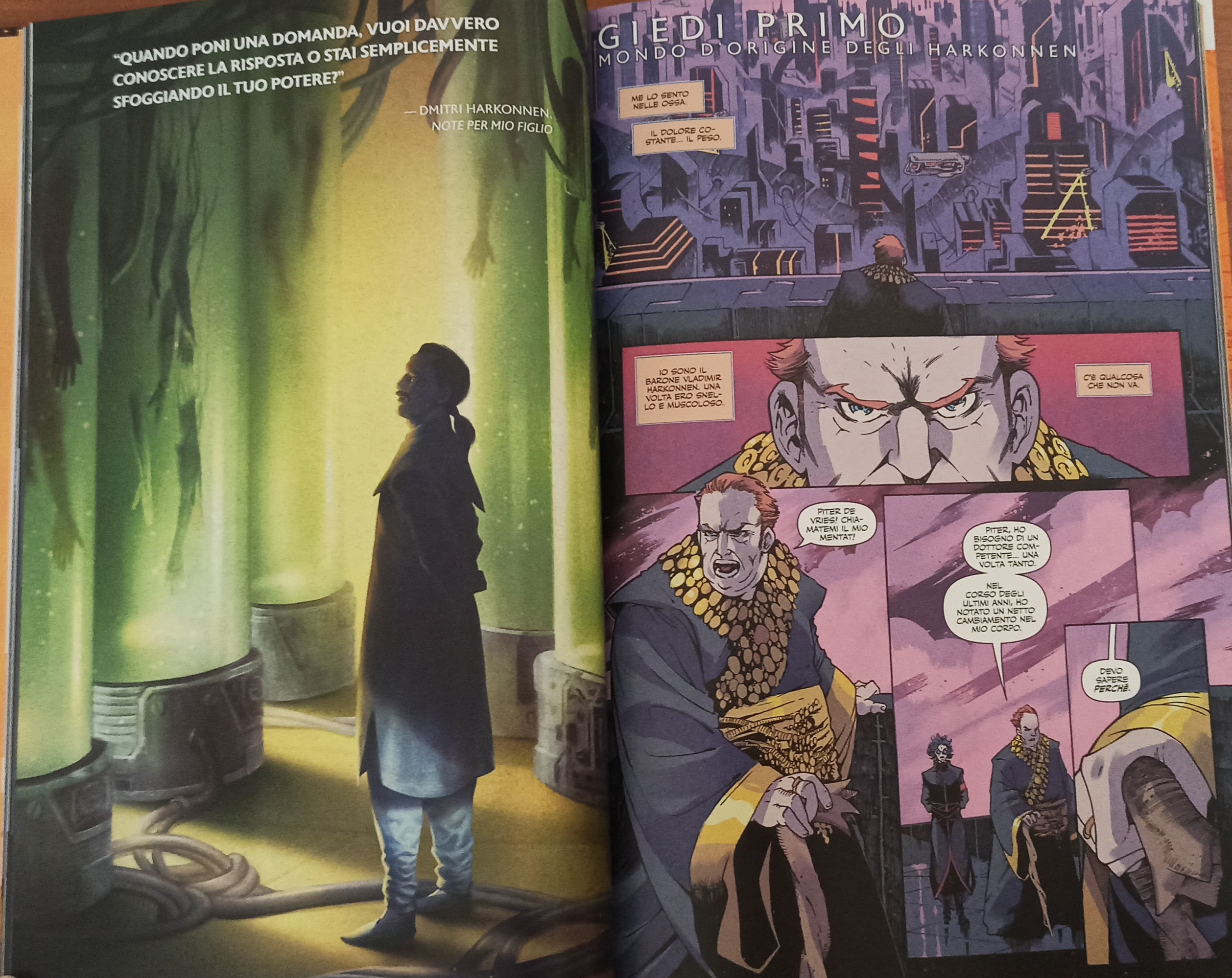 In Dune: casa degli Harkonnen 1, abbiamo delle scoperte interessanti nel laboratorio segreto dei Tleilaxu dove vengono eseguiti degli esperimenti per creare artificialmente due dei più grandi e misteriosi elementi in Dune: la spezia e i vermi del deserto. Scoprendo che hanno un legame molto affine e quasi indissolubile, da analizzare con meticolosità. Verremo sballottati da un pianeta all’altro, da una casata all’altra, mentre gli intrighi e inganni per possedere sempre più potere e per manipolare il destino della profezia del Lisan Al-Gaib, che si farà sempre più intensa. una vera lotta al potere da mangiare con gli occhi sfogliando una pagina dopo l’altra. Infatti, il volume è un prequel degli avvenimenti che si svolgono nel film di Denis Villenueve.