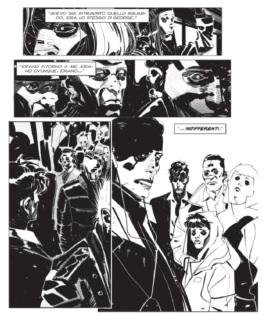 Questo l’incipit del mensile di Dylan Dog 443, Gli Indifferenti. I testi di Rita Porretto e Silvia Mericone ci catapultano in un luogo di ordinaria follia, nelle subway londinesi, ove ogni giorni i destini di migliaia di persone sono destinati ad incrociarsi o perdersi definitivamente.
