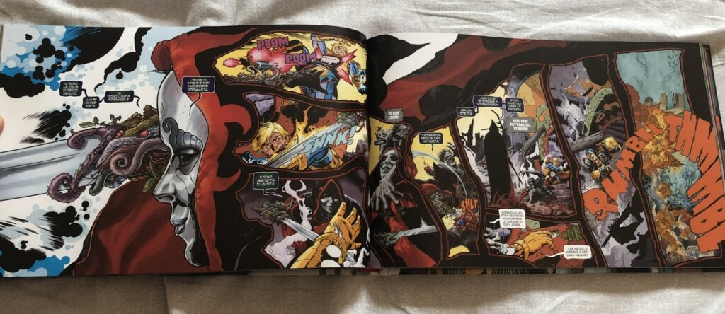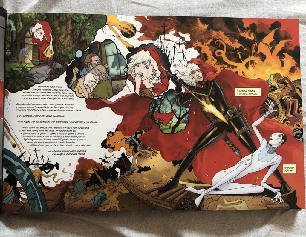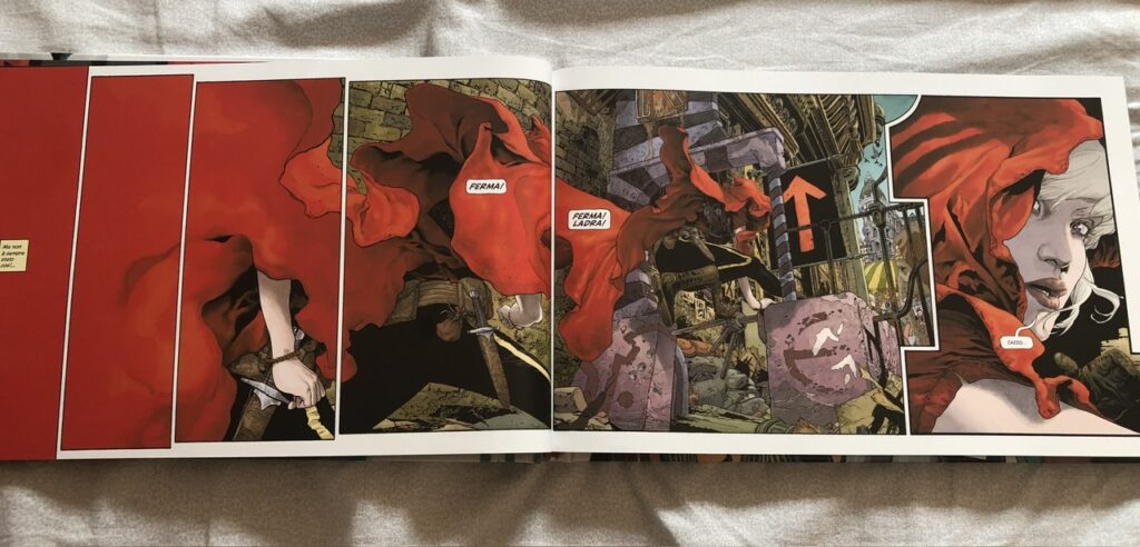Tutti questi elementi rendono la lettura totalmente imprevedibile e per questo ancora più eccitante, portandoci a immaginare cosa ci aspetta nelle pagine seguenti. Anche il passato di questo mondo è avvolto nel mistero e piccoli accenni nei dialoghi tra i personaggi e nelle pagine extra ci fanno porre ancora più domande. Il formato è esso stesso un elemento determinante nel racconto. Le tavole orizzontali permettono al disegnatore di creare una serie di splash-page sempre diverse, molto complesse e ricche di dettagli, ma che risultano comunque facili da seguire.
