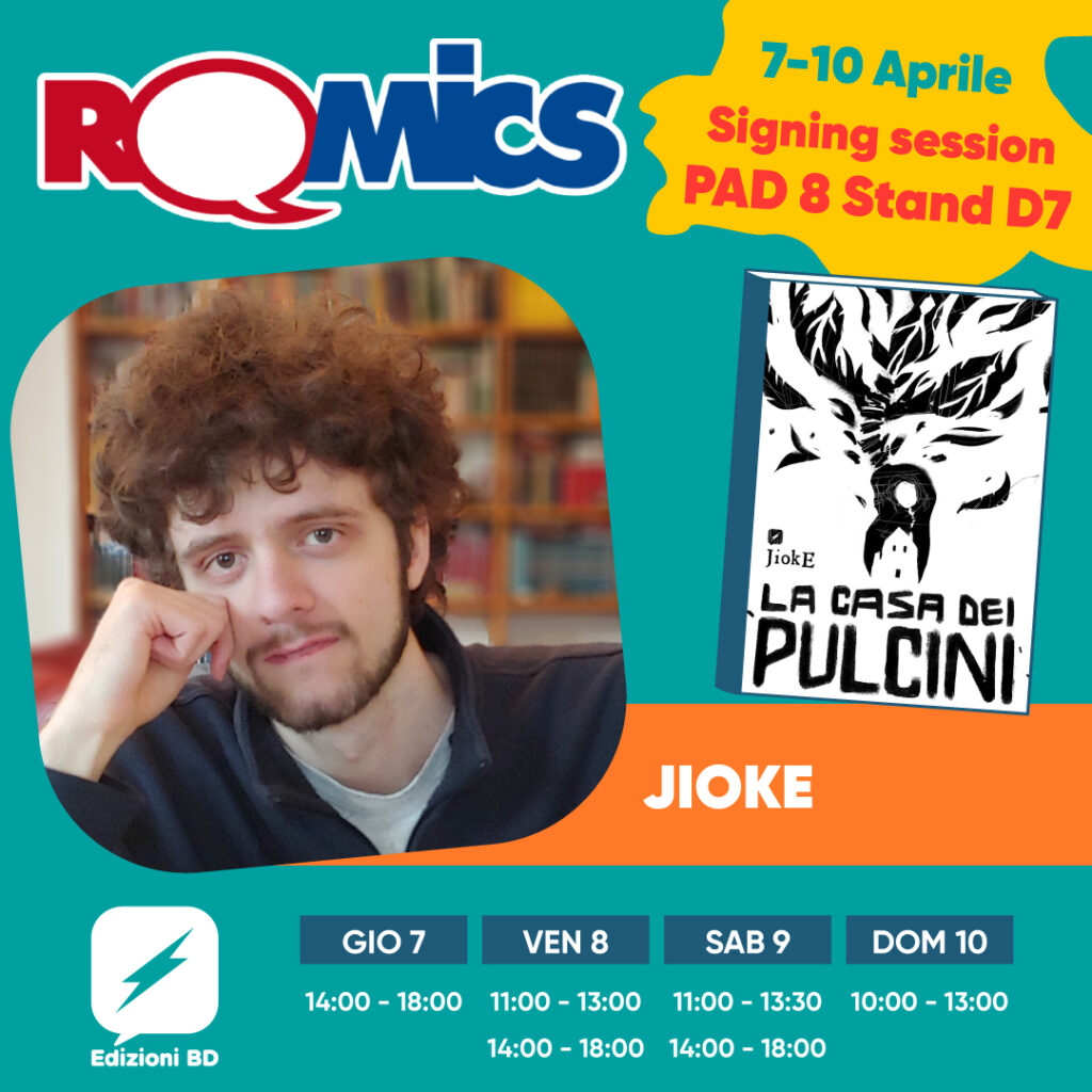 Per Edizioni BD non mancheranno le graphic novel europee, i comics di Boom!Studios e i giovani talenti italiani del progetto editoriale BD Next! Tra gli ospiti italiani: Federico Fabbri, disegnatore di Tristerio e Vanglorio, Walter Leoni, autore del successo di satira SS Tata, Dario Sicchio, sceneggiatore di Black Rock, Roberto D’Agnano, presto in libreria con TrapKid e Giovanni Dell’Oro (in arte JiokE) che dopo il successo di Pazzia presenta in anteprima assoluta La casa dei pulcini: il giovane artista, che ha conquistato i social con i suoi racconti terrificanti raccolti in Pazzia, si cimenta con volume di oltre duecento pagine.