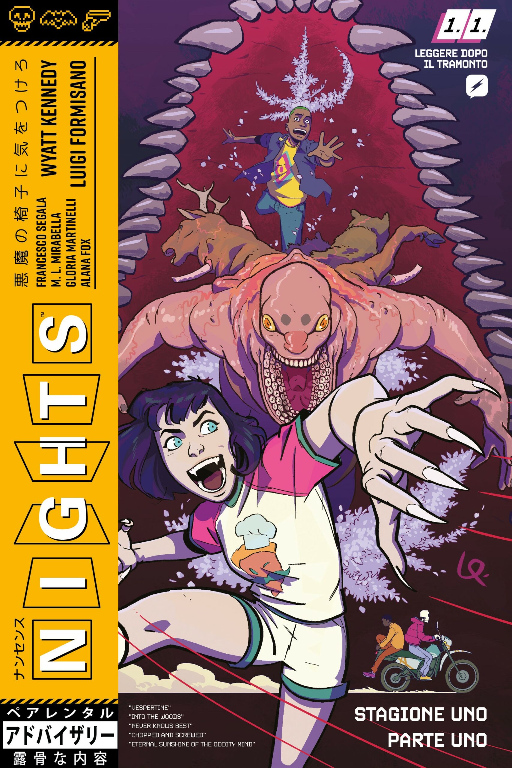 Continua il progetto di curatela del fumettista Simone Di Meo che dopo aver seguito per il catalogo di Edizioni BD la pubblicazione del volume nominato agli Eisner Awards The Cull di Kelly Thompson e Mattia De Iulis, porta in Italia un’altra interessante novità made in USA che farà il suo debutto proprio in fiera: Nights, serie urban fantasy scritta da Wyatt Kennedy con i disegni del talento italiano Luigi Formisano.
