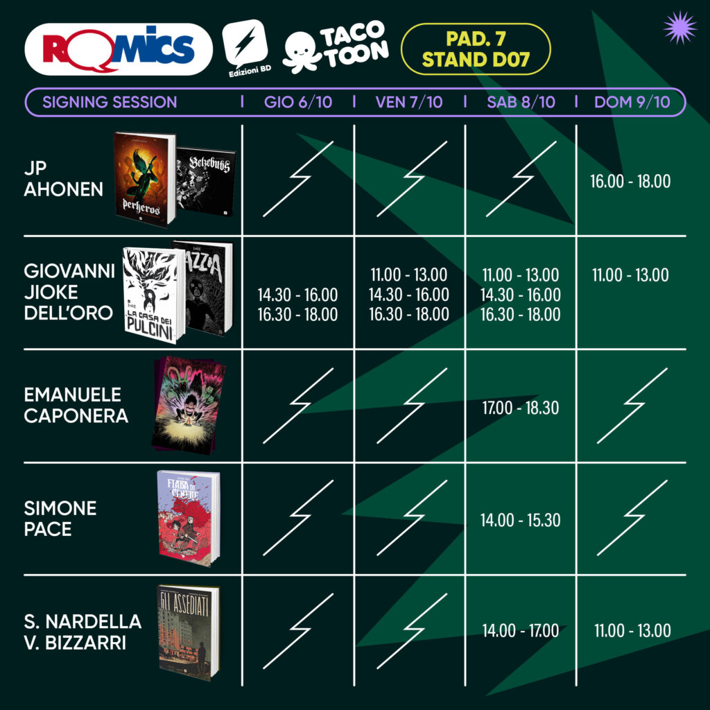 Edizioni BD & J-POP Manga partecipano a Romics 2022, il Festival Internazionale del Fumetto, Animazione, Cinema e Games che si terrà alla Fiera di Roma dal 6 al 9 ottobre! La casa editrice milanese sarà allo Stand D07 del Padiglione 7. Come ogni anno sono tantissime le anteprime e gli ospiti italiani e internazionali che parteciperanno agli incontri e firmeranno le copie allo stand: JP Ahonen, autore di Belzebubs e Perkeros, Giovanni Jioke Dell’Oro (Pazzia, La casa dei pulcini), Vincenzo Bizzarri e Stefano Nardella, autori della graphic novel Gli assediati, ma non solo. Dopo l’esordio delle loro opere sulla piattaforma online TacoToon, a Romics saranno ospiti anche Emanuele Caponera, autore di Salomè, e Simone Pace, autore di Fiaba di cenere, due webcomics di successo che saranno pubblicate in autunno da Edizioni BD. A questo link gli orari signing session degli autori in stand!