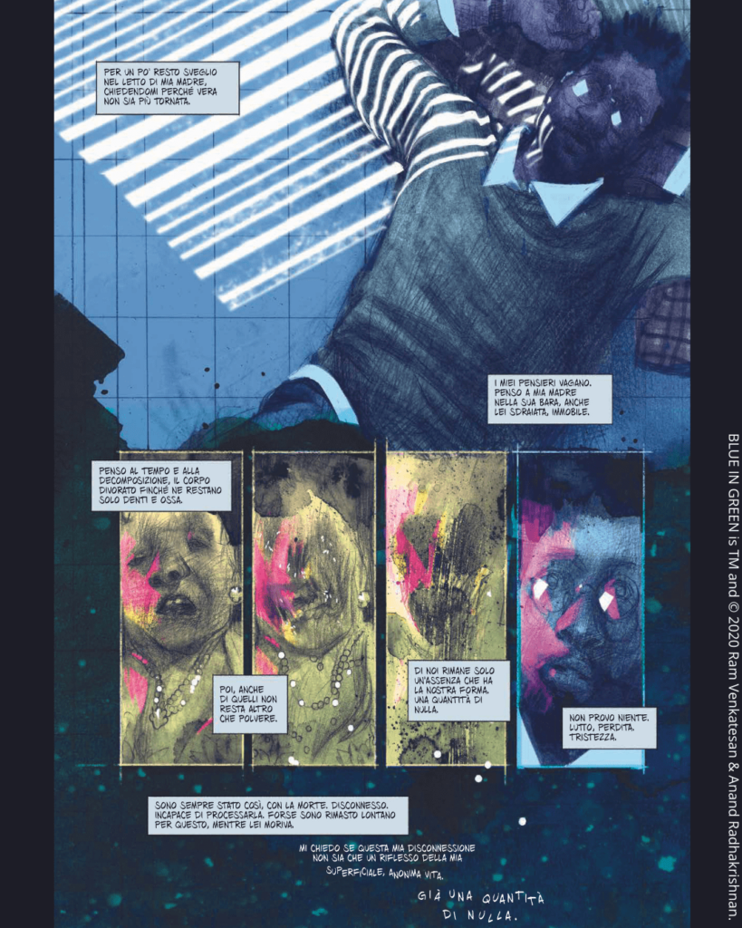 Blue in Green è valso al disegnatore Anand RK e al colorista John Pearson il Premio Eisner 2021 come migliori artisti digitali. Questo imperdibile volume unico, ora disponibile in traduzione italiana a marchio Edizioni BD, sarà in libreria, fumetteria e in tutti gli store online a partire dal 22 novembre.
