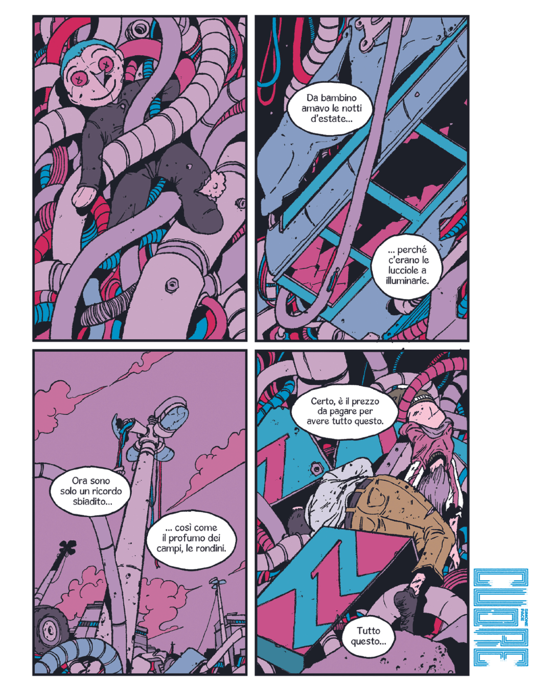 Con lo stile dettagliato e personale che lo contraddistingue, Simone Pace mette in scena una storia dai risvolti inaspettati che ha al centro i temi sempre più attuali dello sviluppo tecnologico incontrollato e del rapporto tra intelligenza artificiale e umanità. Un piacere per gli occhi che nasce come webtoon sulla piattaforma di intrattenimento digitale TacoToon e che ora per la prima volta potrà essere goduto anche in volume.