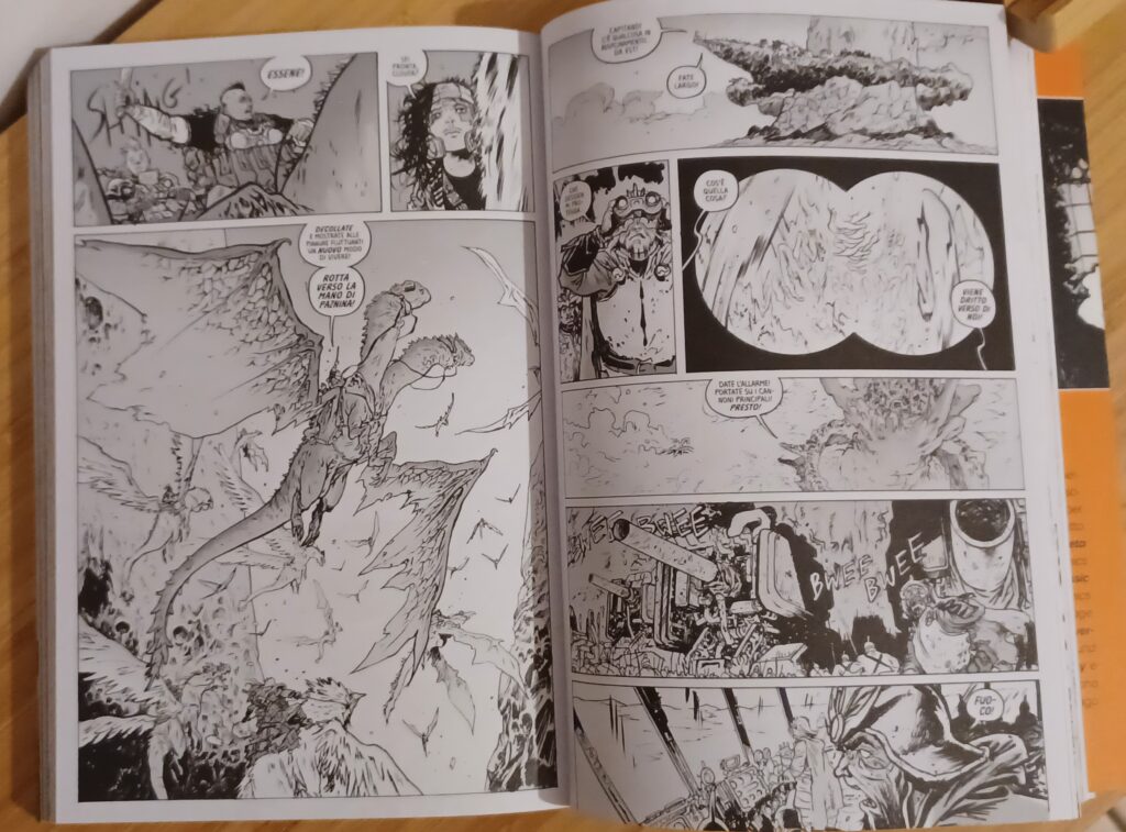 Partendo dal punto di vista estetico, Johnson crea un futuro dove ad elementi fantasy quali creature della mitologia come idre, grifoni e draghi volanti, si uniscono elementi futuristici come grandi navi da combattimento volanti, armature e gigantesche armi futuristiche. I disegni, molto dettagliati e ben sfumati, in particolare nelle scene di combattimento, nel design delle armi e in quello delle creature, mettono in luce la bravura del fumettista statunitense anche sul lato artistico. Il bianco e nero delle tavole fa un ottimo lavoro nell’esaltare l’atmosfera di desolazione della quale l’opera è piena, e rendono le creature fantastiche che incontriamo nel racconto a dir poco realistiche, insomma è disegnato in maniera divina, ci sono doppie spash page che stordiscono da tanta roba Johnson è riuscito ad infilarci, la storia scorre bene, ed ha talmente tanti elementi che chi la legge non può non trovare qualcosa che gli piaccia.