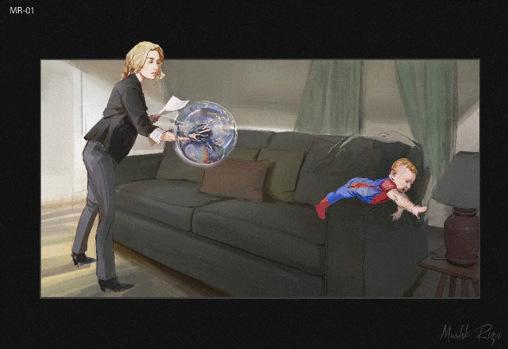 Il concept art in questione, realizzato dall’artista Marvel Mushk Rizni, raffigura Sue Storm (Vanessa Kirby) che usa i suoi poteri di campo di forza invisibile per creare una bolla protettiva intorno al figlioletto Franklin, che sta per cadere da un divano. Ciò che salta all’occhio non è la dimostrazione di potere di Sue, ma l’abbigliamento di Franklin: il bambino indossa il pigiama di Spider-Man. Questo dettaglio apparentemente innocente contraddice direttamente quanto ci è stato detto sulla collocazione temporale del film all’interno del multiverso Marvel.