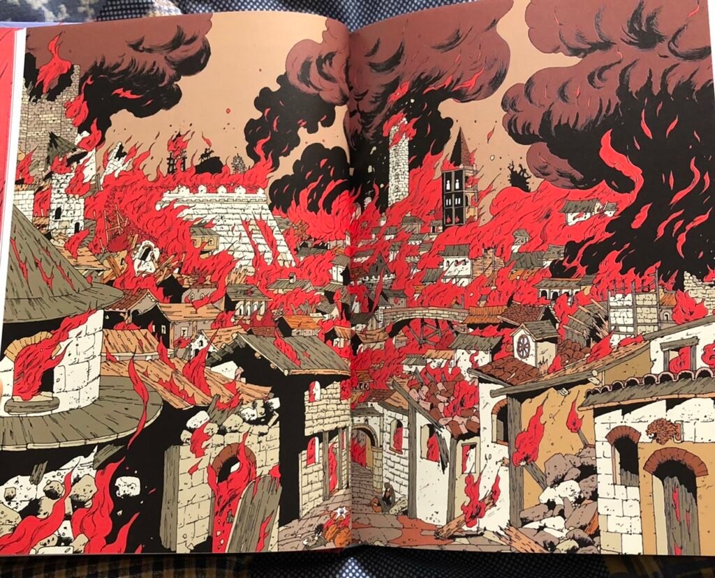 Dal punto di vista dei disegni, ho trovato il tratto di Simone Pace perfettamente funzionale alla tipologia di racconto. Un segno molto marcato e dettagliato in ogni tavola, sia nelle scene d’azione che nei grandi paesaggi e nelle espressioni dei personaggi. Il tutto viene poi esaltato dalla colorazione, avvicinando ancora di più il racconto a certe stampe medievali e all’iconografia tradizionale di quel tempo. In quest’ottica spesso la storia si fa muta per lasciar “parlare” il disegno. Il rosso è onnipresente in quasi ogni pagina, ma se a volte resta solo accennato si fa invece dominante nei momenti più drammatici e verso il finale.