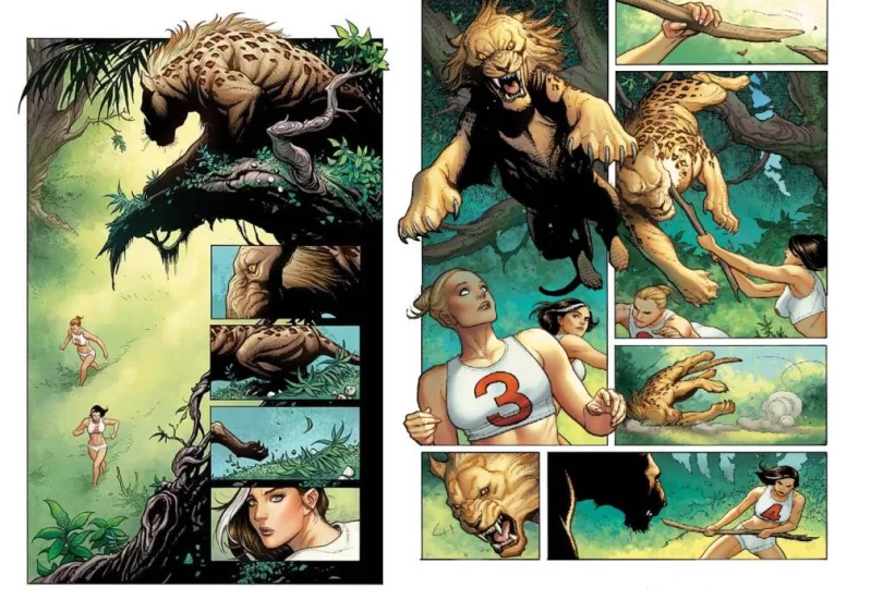 Chi conosce Cho sa quanto ami disegnare corpi femminili e come quindi si trovi perfettamente nella sua confort zone o come si sia divertito nella sua creazione, regalando gioia per gli occhi non solo con le protagoniste, ma anche con i bellissimi scenari. Ambientazioni estremamente ottime per fare risaltare la capacità di Cho di creare scenari in cui la sua mano possa dare vita non solamente a donne prorompenti, ma anche di dar vita a una serie di creature feroci, acuendo quella sensazione di contrasto tra uomo e natura o in questo caso tra donna e natura. Il suo disegno del corpo femminile, elemento identificativo dell’arte di Cho, ammicca e seduce, sviluppando una dinamicità esplosiva impeccabile.