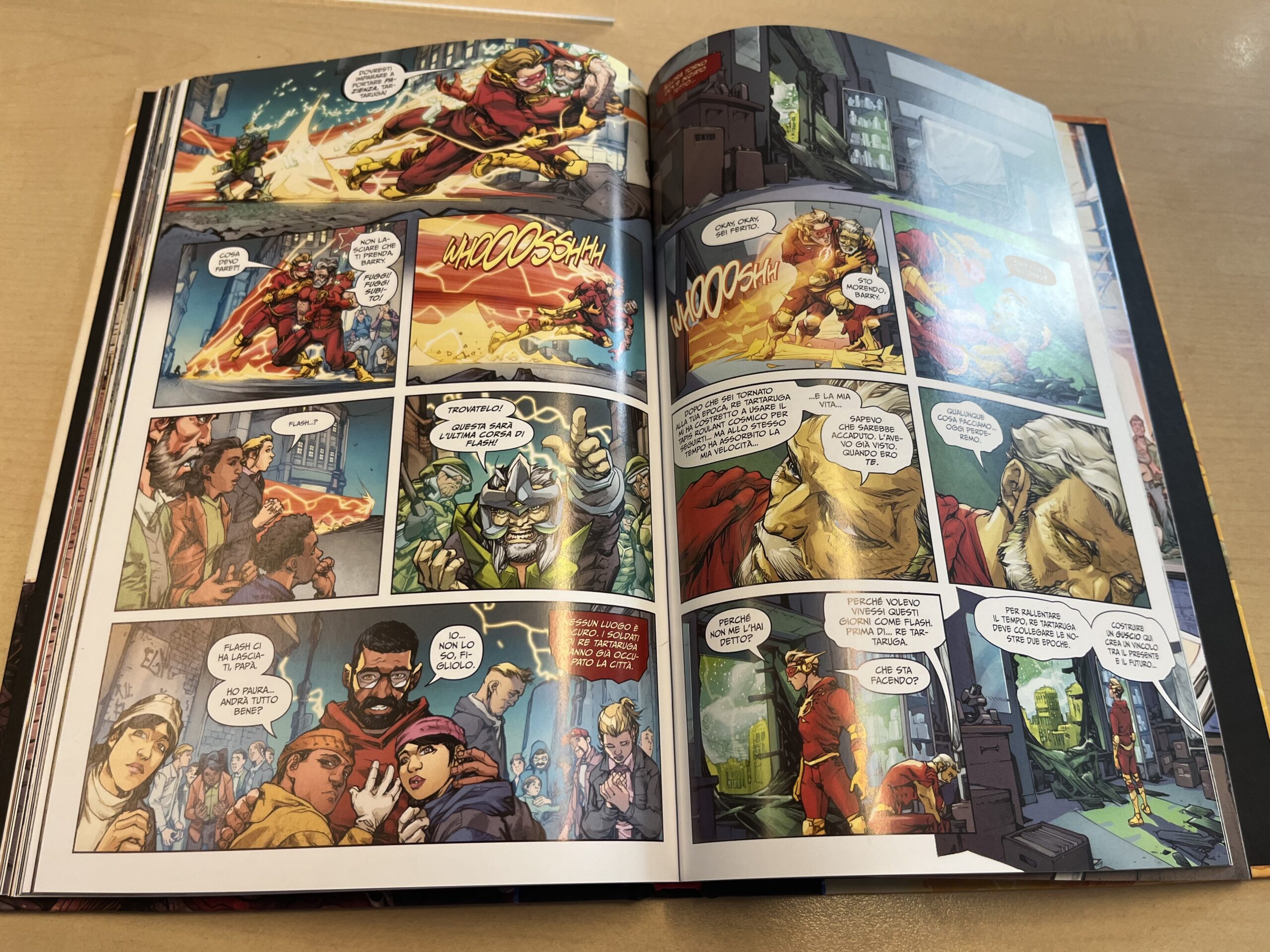Flash, come spesso accade, si trova a viaggiare nel tempo e si ritrova in un futuro distopico, in cui il mondo è dominato dall’uomo tartaruga che, come in ogni classico del genere, ha costruito un regime semitotalitario che ha schiacciato ogni libertà. La storia, ricca di azione e colpi di scena, si gioca molto sul carisma del villain ben caratterizzato con poche pagine spiegandone origini e motivazioni e sul rapporto duale e ambivalente tra il Flash del presente e quello del possibile futuro. Infatti, il Flash del futuro, che ha perso ogni speranza e vede come inevitabile la sconfitta, nella prima parte ha grande capacità di condizionare negativamente la sua controparte giovane.