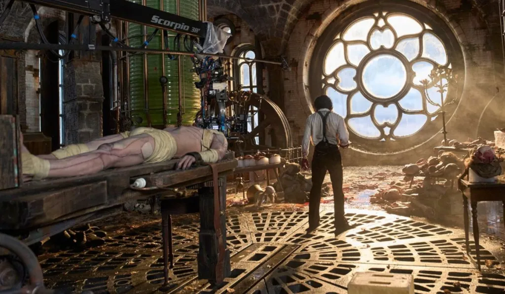 - Estetica lussureggiante e orrore corporeo: Il film esplode di una maestria visiva che richiama le sue opere precedenti (Crimson Peak, La Forma dell’Acqua). Ogni fotogramma è intriso di splendore gotico, con immagini smaltate, simbolismo elaborato e scenografie sontuose (come il laboratorio di Victor, epico nella sua grandiosità quasi fantascientifica). L’opera è un romanticismo gotico cucito con elementi di dark fantasy e body-horror—si vedano le scene di Victor che scava organi e sega ossa stridenti. L’ossessione per i dettagli, la “filigrana con dettagli d’epoca infinitamente precisi,” assicura che il film sia un piacere per gli occhi, anche se a volte si percepisce un senso di “troppo pieno” nella sua lussuria visiva e nelle sue due ore e mezza di durata.