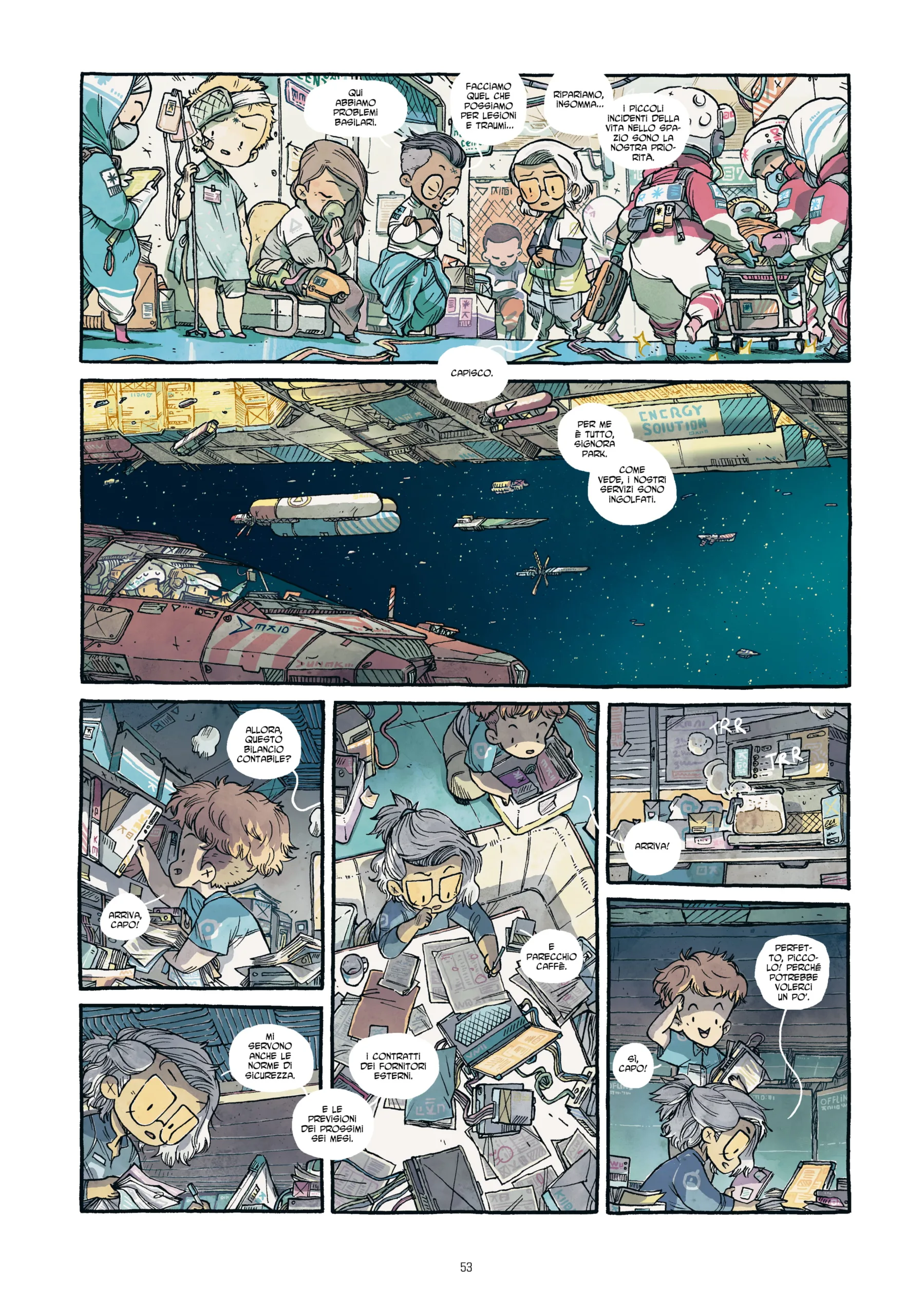 L’ultima protagonista di questa storia è Camina, una ragazza che lavora da anni come mercenaria dello spazio. Durante l’ultima azione di sabotaggio di una nave nemica ha perso un braccio e questo evento la porta a riconsiderare tutta la sua vita. Decide quindi di provare a fare del bene ripulendo il cielo dagli infiniti detriti formatisi da anni di sfruttamento senza scrupoli delle compagnie e che stanno diventando un pericolo per i viaggi spaziali. Proprio durante una delle sue prime missioni si imbatte casualmente in Ji-Soo e Alex.