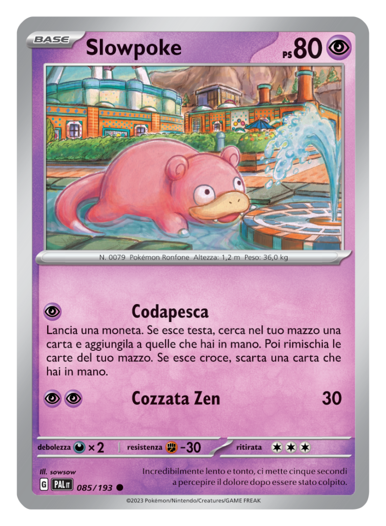 Slowpoke, Pokémon di prima generazione, illustrato da Sowsow all’interno della città principale di Paldea, Mesapoli. Questa carta base, con 80 PS, ha due mosse: Codapesca, al costo di una Energia Psico e Cozzata Zen per 2 Energie Psico. La prima mossa ci permette di cercare nel mazzo una qualsiasi carta ed aggiungerla alla mano, ma possiamo farlo solo se lanciando una moneta esce testa. Se dovesse uscire croce, invece, dovremmo scartare una carta dalla nostra mano. La seconda mossa, Cozzata Zen, infligge semplicemente 30 danni al nostro avversario.
