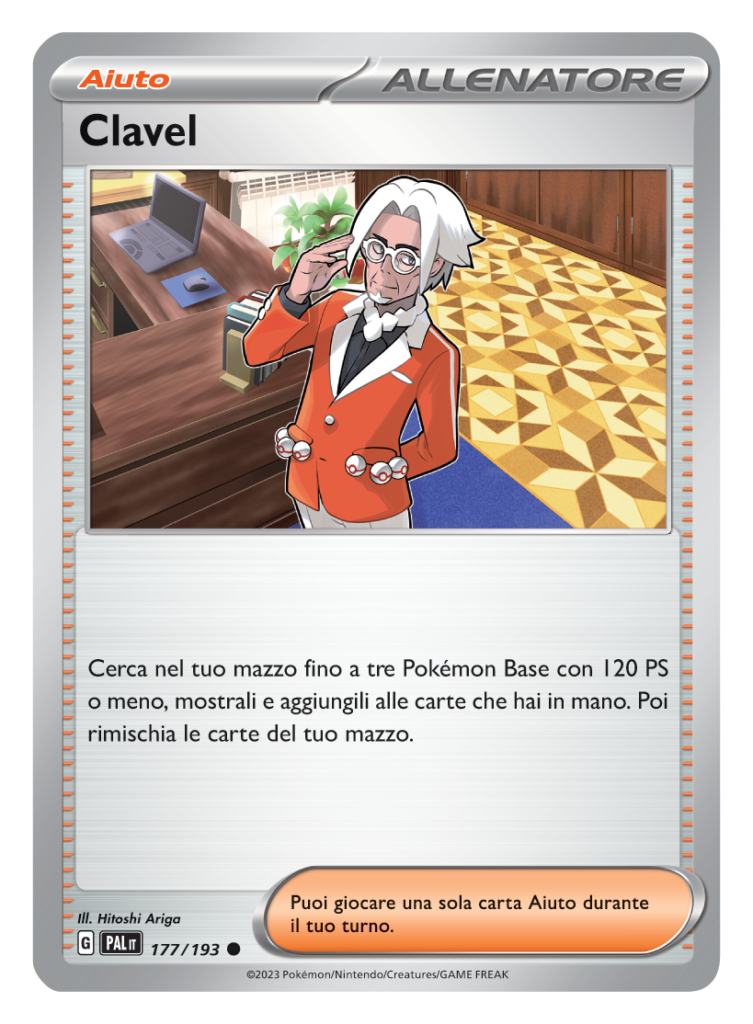 Clavel, preside dell’accademia in Pokémon Scarlatto e Violetto, arriva all’interno della nuova espansione del GCC Pokémon come Carta Aiuto. Questa carta ci permette di cercare ben 3 Pokémon Base, a patto che abbiano meno di 120 PS, nel nostro mazzo ed aggiungerli alla nostra mano, utilissima per prepararci ad aggiungere creature di Fase 1 o 2 nei turni successivi.