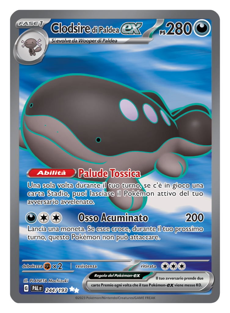 Clodsire è nativo della regione di Paldea ed entra a gamba tesa nel GCC Pokémon con la nuova espansione. Questa carta EX, evoluzione di Wooper di Paldea, dotata di ben 280 PS ha l’abilità peculiare Palude Tossica. Questa abilità, una volta per turno e con una carta Stadio attiva, avvelenerà un Pokémon avversario. La mossa Osso Acuminato, al costo di un Energia Buio e 2 Energie Normali, ci permetterà di provocare grandi danni alle creature nemiche, ma come “contro” dovremmo lanciare una moneta, non potremo attaccare nel turno successivo se dovesse uscire croce.