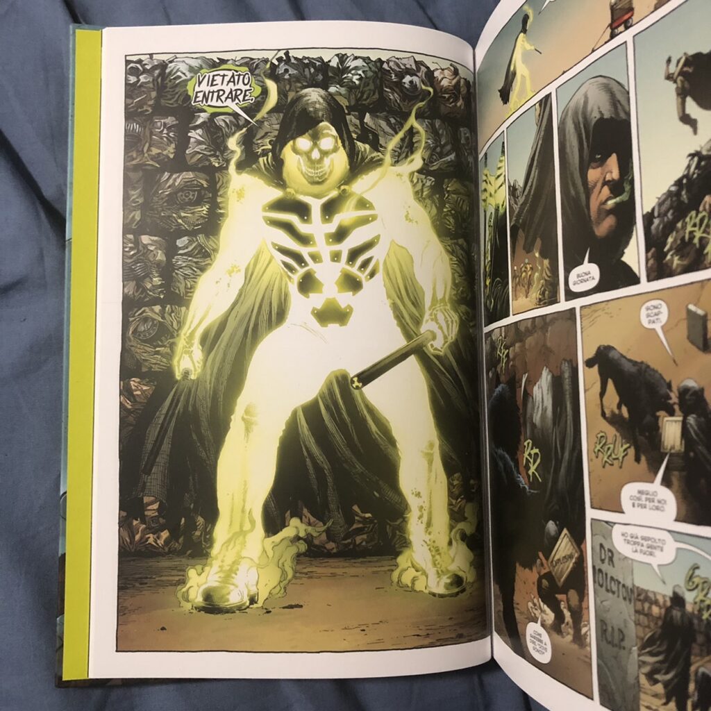 Sono tanti i combattimenti e le scene d’azione, magistralmente disegnati da Gary Frank, che mettono in mostra le abilità di Geiger e giocano molto sul contrasto tra la luce emanata dall’uomo radioattivo e il paesaggio scuro e vuoto che lo circonda. Ma la storia è anche ricca di dialoghi, perfettamente calibrati da Johns per portare avanti la vicenda e approfondire ogni personaggio.
