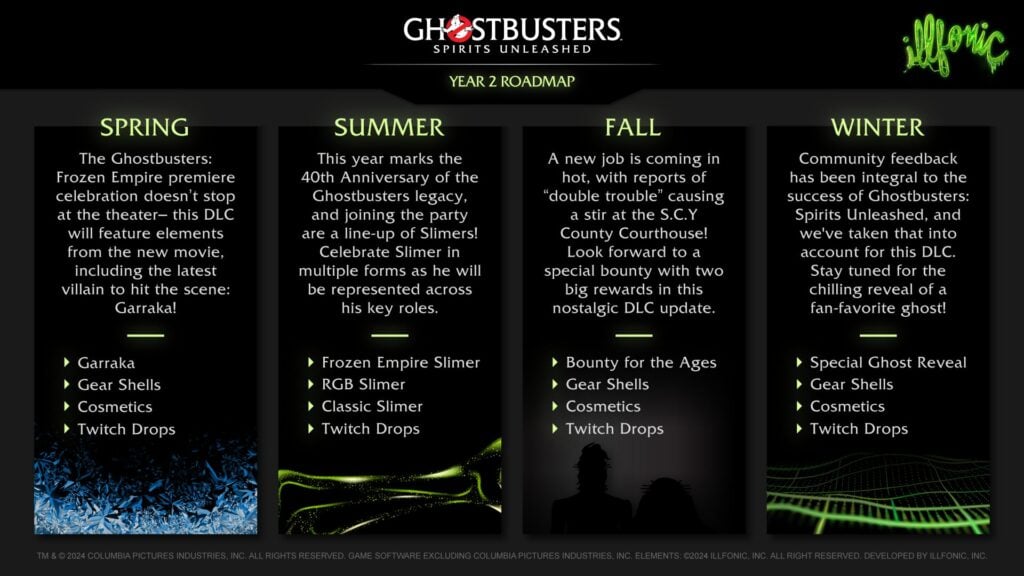 IllFonic ha annunciato la roadmap di contenuti scaricabili gratuitamente per il secondo anno del gioco multigiocatore asimmetrico Ghostbusters: Spirits Unleashed, che si concentra su sensazioni, equipaggiamento, gadget e fantasmi.