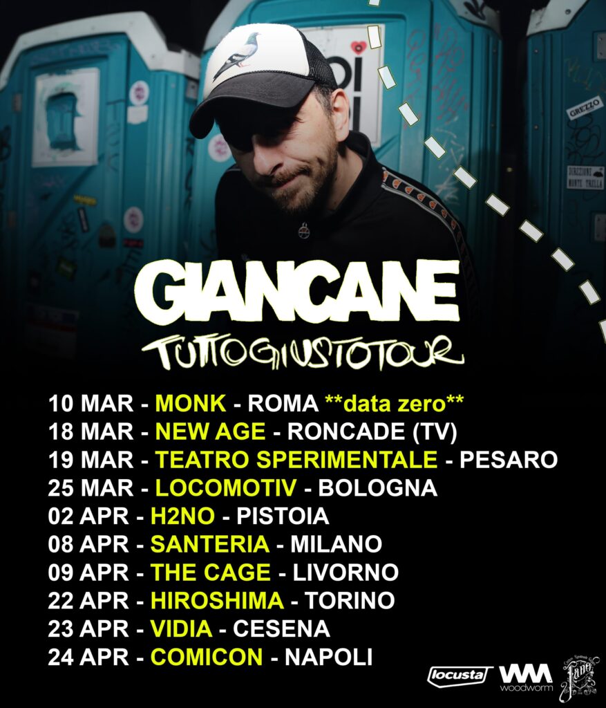 Giancane è pronto a tornare sul palco nei principali club italiani con TUTTOGIUSTOTOUR. Dopo i tantissimi concerti estivi con L’inizio della Fine Tour, il cantautore romano torna sui palchi dei live club italiani con un nuovo spettacolo. Il tour – inizialmente previsto per questo febbraio – prenderà il via con una data zero proprio a Roma, il 10 marzo al Monk. Non poteva esserci inizio migliore per TUTTOGIUSTOTOUR, che proseguirà poi il 18 marzo da Roncade (New Age), a Pesaro (Teatro Sperimentale) il 19 marzo, Bologna (Locomotiv) il 25 marzo, Pistoia (H2NO) il 2 aprile, Milano (Santeria) l’8 aprile, Livorno (The Cage) il 9 aprile, Torino (Hiroshima) il 22 aprile, Cesena (Vidia) il 23 aprile, Napoli (Comicon) il 24 aprile. Le prevendite per la data zero e per gli altri appuntamenti di TUTTOGIUSTOTOUR sono già disponibili a questo link: https://www.locusta.net/eventi/giancane-tuttogiustotour-2022/.