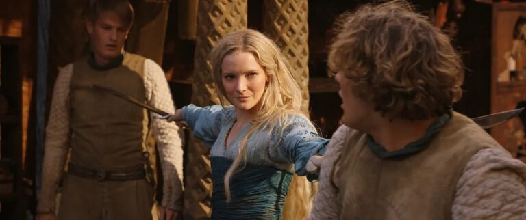 Vediamo Arondir e Bronwyn rivolgersi al popolo delle Terre del Sud che è fuggito a Ostirith, molto probabilmente dando l’ultimatum di Adar e proponendo una risposta appropriata. Vediamo anche diversi confronti: in Numenor c’è faccia a faccia tra Kemen ed Earien, uno tra Galadriel e Halbrand, e uno tra Isildur ed Elendil; mentre in Lindon vediamo Gil-galad ed Elrond parlare probabilmente del giuramento di quest’ultimo al principe Durin e che abbiamo visto nel trailer che sarebbe stato messo alla prova. Poi arriva un’interessante foto (presente anche nel promo) dove Galadriel sembra allenare i Numenoreani. Alla fine, Theo si confronta finalmente con Arondir sull’arma che ha trovato e di cui gli Orchi sono molto interessati.