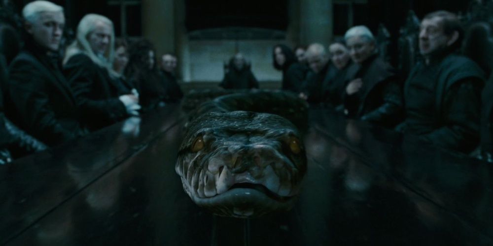 Quando Harry fu apparentemente ucciso da Voldemort, Nagini fu liberata dall’incantesimo protettivo perché riteneva che non ci fossero più minacce alla sua vita, e fu drappeggiata intorno alle spalle di Voldemort durante la marcia della vittoria dei Mangiamorte verso Hogwarts.