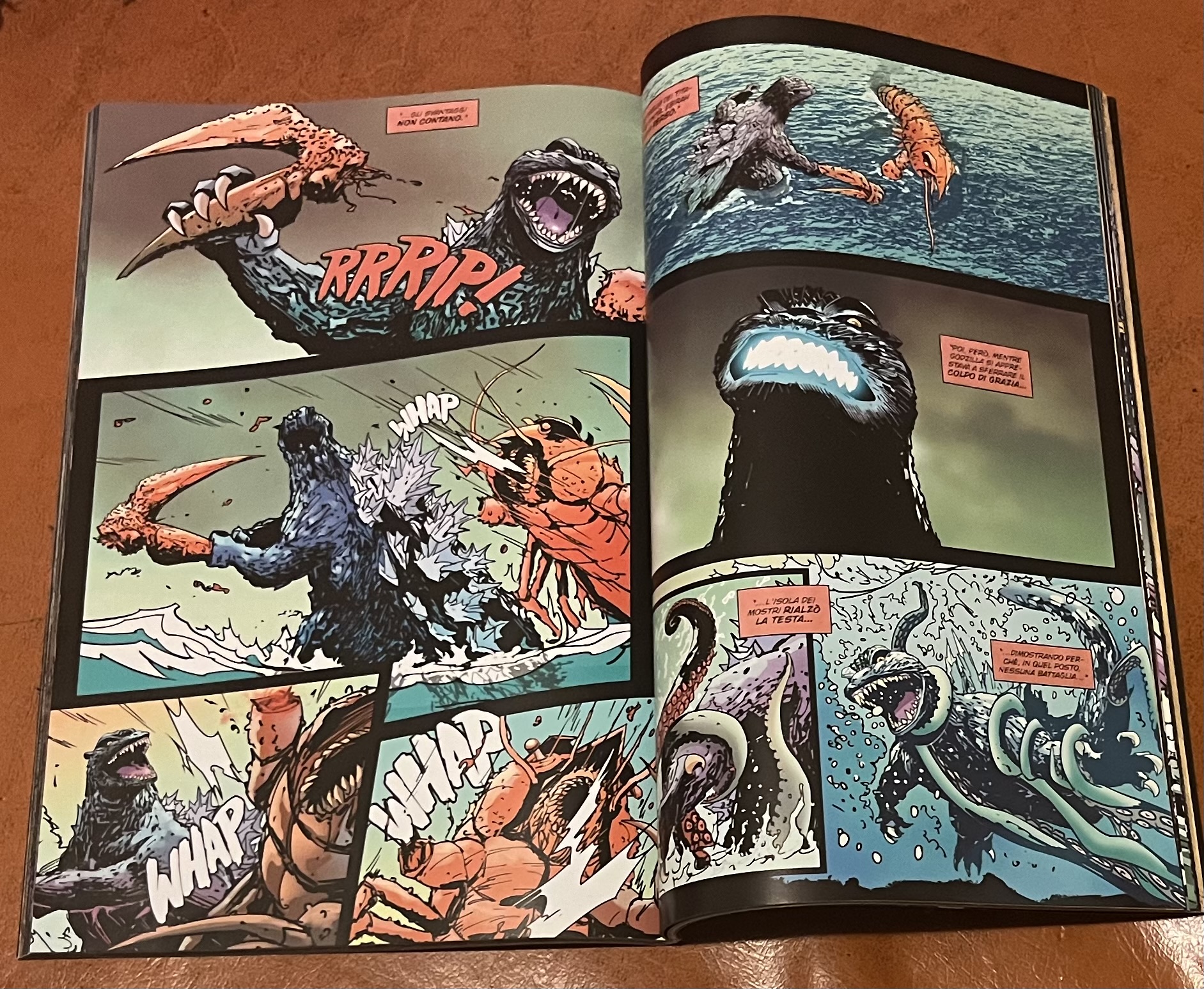 Sicuramente la sequenza narrativa più accattivante sul piano narrativo di Godzilla: Hic Sunt Dracones, è quella ambientata nel passato durante la spedizione sull’isola. Qui si concentrano le sequenze più spettacolari, gli scontri, tra uomini e Kaiju e tra gli stessi Kaiju. L’irrilevanza dell’essere umano di fronte la forza imperiosa della natura è evidente sin dalla spettacolare copertina, che mette in relazione una nave pirata con il ben più maestoso Godzilla. Si percepisce durante tutto il racconto il senso di inadeguatezza dei protagonisti, formiche di fronte a dei giganti. In ogni caso comunque, al di là delle tante mazzate, la sequenza sull’isola narrativamente è abbastanza lineare, ricalcando perfettamente modi e tempi, di una storia di pirati che si muove tra l’iniziale caccia al tesoro fino alla sua spartizione, con la prevedibile resa dei conti finale. I Kaiju apparentemente sullo sfondo, ricoprono invece in alcuni punti, il ruolo di deus ex macchina della narrazione.