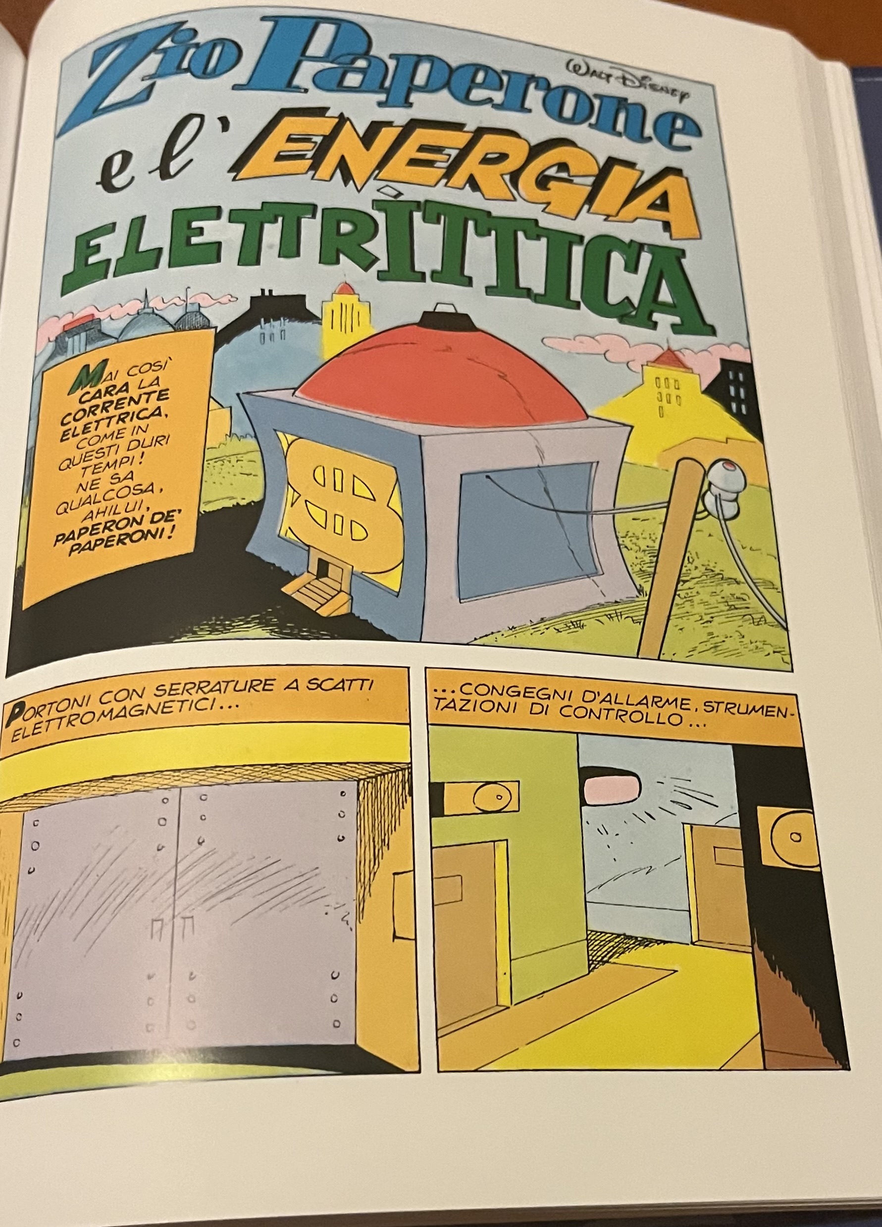 Partiamo da “Zio Paperone e l’energia elettrittica.” In questa storia Romano Scarpa si collega all’attualità di allora e in fondo anche di oggi, raccontandoci di uno Zio Paperone costretto a fare i conti con una salatissima bolletta della luce. Il motivo ? La crisi petrolifera del ’73 diretta conseguenza della terza guerra Arabo-Israeliana. Scritta nel ’76 e condita da un’ironia tagliente, con questa storia il maestro ci racconta attraverso i personaggi Disney la necessità di arrangiarsi e di trovare fonti elettriche “alternative”. Chissà che la vecchia tuba non possa dare qualche spunto a gli italiani di ieri e di oggi!