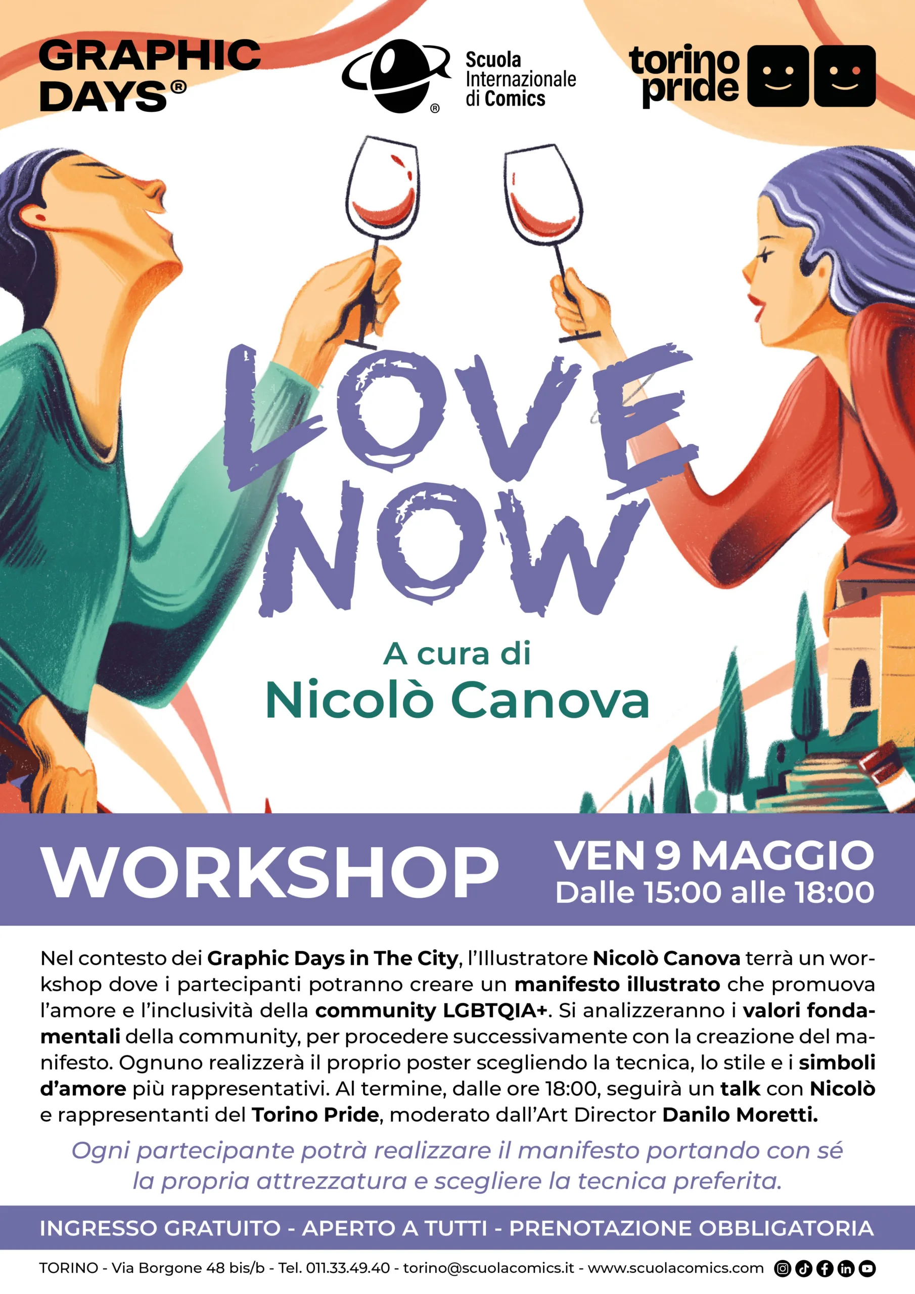 Venerdì 9 maggio dalle 15 alle 18 l’Illustratore Nicolò Canova terrà un workshop nel quale i partecipanti avranno la possibilità di creare un manifesto illustrato che promuova l’amore e l’inclusività della community LGBTQIA+. Per prendere ispirazione e dare sostanza al progetto, saranno analizzati in un primo momento i valori fondamentali della community, che faranno da spunto alla realizzazione del manifesto stesso. Ciascuno dei partecipanti avrà la possibilità di realizzare il proprio poster scegliendo la tecnica, lo stile e i simboli d’amore che ritiene più rappresentativi.
