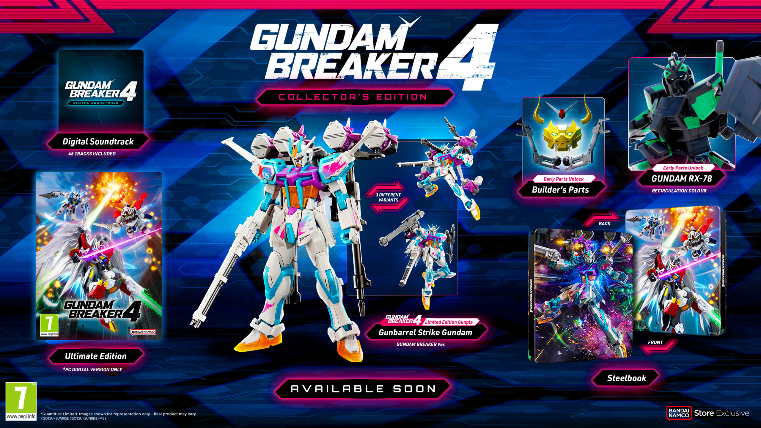 Inoltre, sarà disponibile anche una Collector Edition del gioco nel Bandai Namco Store, che include la versione Ultimate del gioco, un Gunpla in edizione limitata, Gunbarrel Strike Gundam (GUNDAM BREAKER ver.), la colonna sonora in formato digitale e una steelbook.