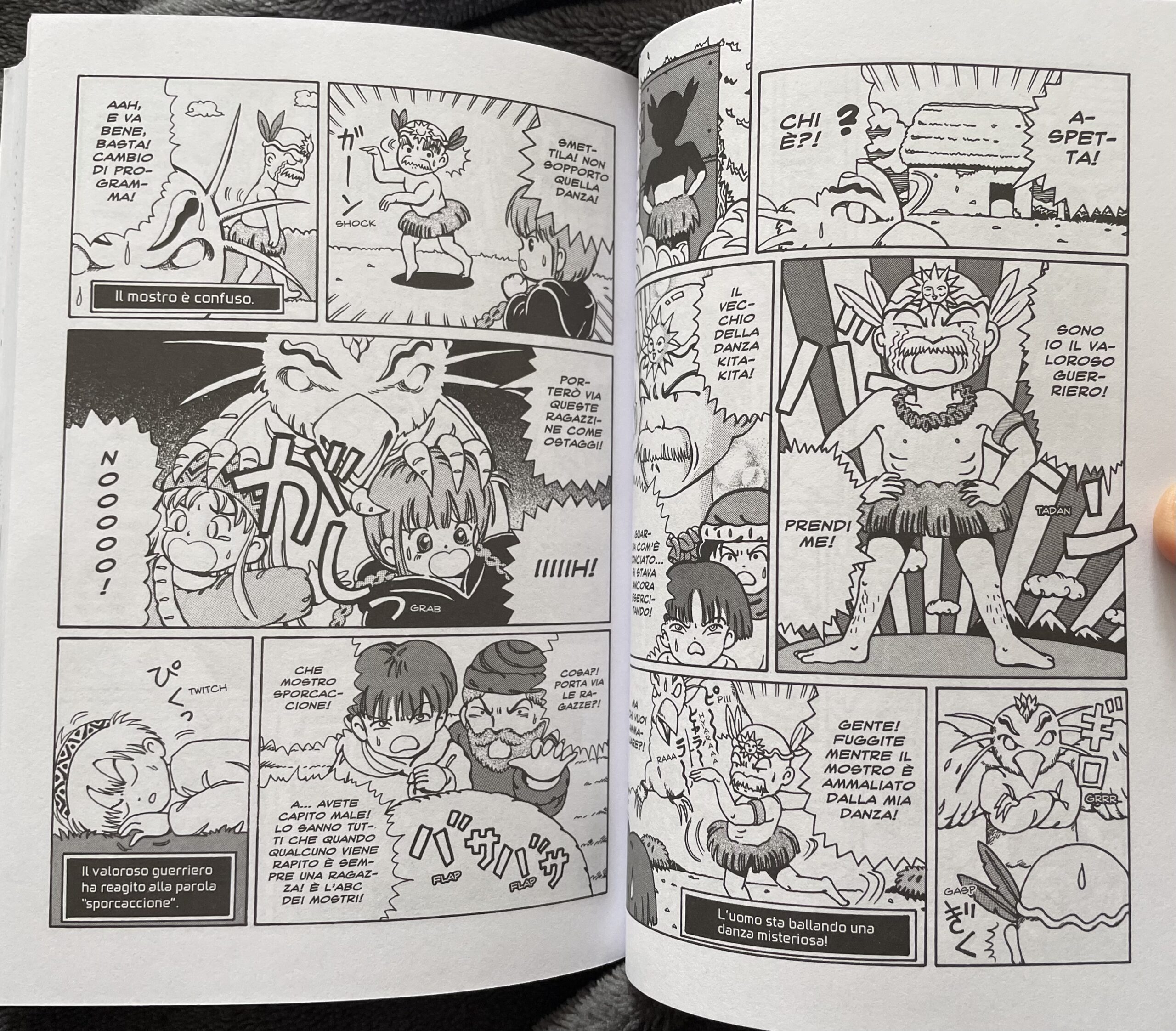 Allo stesso modo, il disegno è perfetto per questo tipo di storia a metà tra il fantasy e il gag manga. Adottando uno stile molto caricaturale per i personaggi, l’autore ci fa capire sin da subito che la storia non va presa troppo sul serio, ma sceglie invece di essere dettagliato e preciso nel world building, come nel design dei mostri, delle location o delle armi e delle magie, che presentano nomi piuttosto buffi e ironici. Alcuni elementi sono diventati ormai iconici per chi ha visto l’anime, come il vecchio della danza KitaKita, un anziano signore in abiti succinti che viene continuamente sbeffeggiato e ignorato da tutti, ma che è presente in molti tra i momenti più divertenti di questo primo volume.