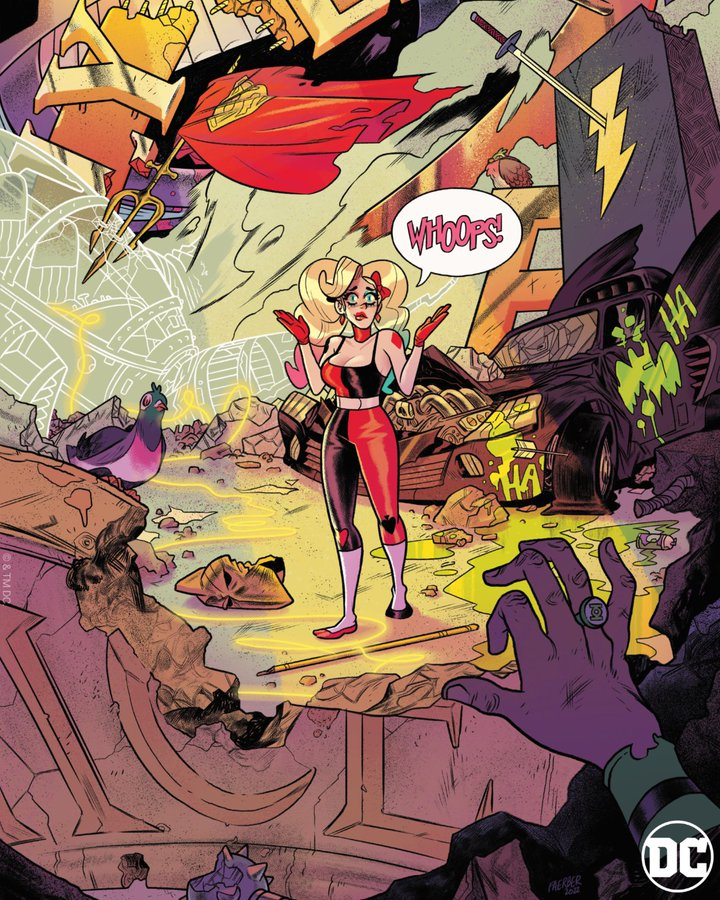 Durante il panel, Tieri ha anche svelato la trama del nuovo titolo, rivelando che si tratterà di viaggi nel tempo. La storia vede Harley tornare a Coney Island, dove scopre di aver ereditato una macchina del tempo. Tuttavia, dopo aver usato il dispositivo per un rapido viaggio nel tempo, ritorna involontariamente in una versione alterata del presente, in cui l’Universo DC è sotto il controllo di Starro il Conquistatore. Il danno alla linea temporale è così esteso che è riuscito persino a “rovinare” le origini di tutti gli eroi della DC. Harley deve quindi trovare un modo per annullare la catastrofe cronologica