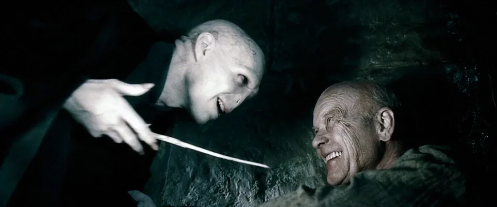 Sebbene questo aspetto dei Doni della Morte Parte 1 differisca notevolmente dal materiale originale, l’adattamento cinematografico vede Gellert Grindelwald rivelare a Voldemort la vera ubicazione della Bacchetta di Sambuco. Spiega di aver perso la bacchetta molti anni fa con Albus Silente, con il quale l’oggetto è ancora sepolto. Dopo un momento di rabbia e panico, il Signore Oscuro lascia Grindelwald e si reca alla tomba di Silente, che rompe con noncuranza e vi trova nascosta la Bacchetta di Sambuco. Ora che si sente il proprietario della bacchetta più potente della storia, Voldemort si considera imbattibile e inizia a pianificare la caduta di Harry.