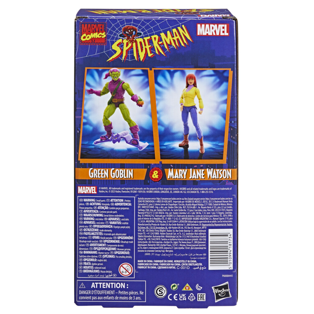 Impossessandosi ancora una volta della mente di Norman Osborn, Green Goblin mira a vendicarsi di Spider-Man rapendo Mary Jane Watson. Queste action figure da collezione Marvel Legends sono disegnate per assomigliare ai personaggi di Mary Jane Watson e Green Goblin del cartone animato Spider-Man: The Animated Series del 1994, con dettagli di qualità premium, molteplici punti di snodo e 6 accessori ispirati alla serie. Con oltre 80 anni di storia, Marvel è diventata una pietra miliare nelle collezioni dei fan di tutto il mondo. Con la serie Marvel Legends, i personaggi preferiti del Marvel Comic Universe e del Marvel Cinematic Universe sono progettati con dettagli ed articolazioni di altissimo livello per essere messi in posa ed esposti. Dalle action figure ai veicoli, fino agli articoli per roleplay, la Serie Marvel Legends offre ai fan oggetti da collezione Marvel ispirati ai personaggi piùiconici. Action figure aggiuntive vendute