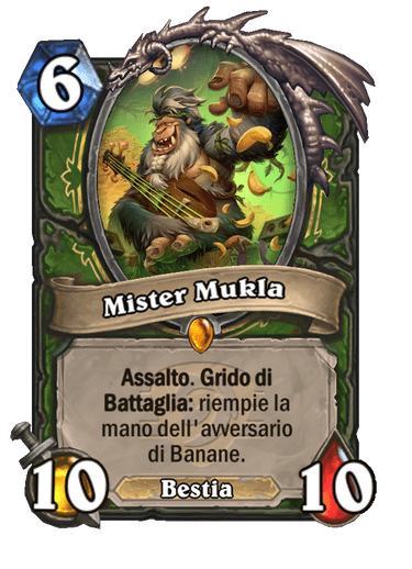 Su questa carta c’è pochissimo da dire. 6 Mana, un body 10/10, Assalto e fa scartare una carta all’avversario, cos’altro dire in più? Scherzi a parte (ma nemmeno tanto) questa carta siamo sicuri che farà parte di qualsiasi mazzo del Cacciatore che uscirà dopo Festival delle Leggende. Le banane che verranno messe in mano all’avversario sono delle magie che danno +1/+1 a un servitore. Se questa carta viene giocata contro mazzi che usano pochi minion, e dunque le banane sono inutili, o mazzi control che hanno tante carte in mano e dunque ricevono 1 o 2 banane al massimo, non solo fa scartare la prima carta del mazzo all’avversario ma mette anche un minion 10/10 in campo. Veramente devastante.