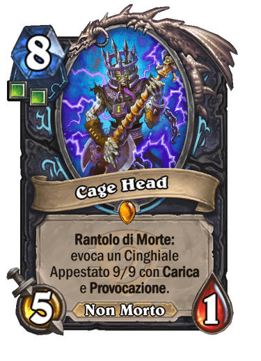 Iniziamo la classifica con il servitore Leggendario di Festival delle Leggende del Cavaliere della Morte: Cage Head. Questa carta ha un Rantolo di morte di per se molto interessante, e nella stessa espansione avremo vari modi per attivarlo più volte. Potremo, ad esempio dare questo Rantolo di morte a tutti i nostri servitori grazie alla nuova magia a 2 mana. Oppure potremo utilizzare uno dei vari strumenti per rievocare servitori e non morti distrutti. Non dobbiamo nemmeno aver paura che il nostro avversario possa silenziarlo visto che esistono vari setup per distruggere subito questo servitore. La pecca maggiore è il costo, veramente eccessivo, e il fatto che senza le giuste condizioni potremo non attivare il Rantolo di Morte.