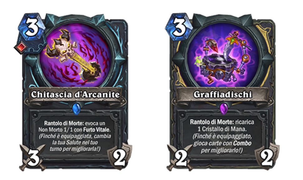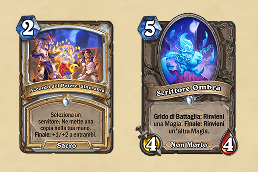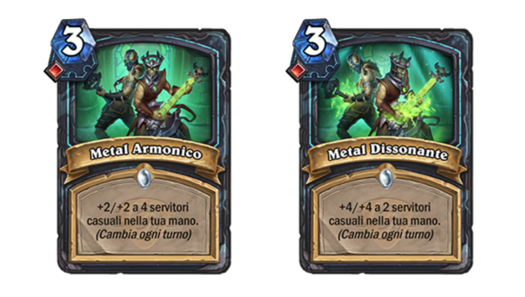 Un’altra nuova meccanica annunciata per questa espansione è quella delle magie armoniche. Queste magie hanno due versioni che si scambiano ogni turno e starà a noi decidere quando utilizzarle. Ad esempio la magia armonica del Cavaliere della Morte è composta da due versioni: “Metal Armonico” e “Metal Dissonante“. Nella prima forniremo +2/+2 a 4 serivitori nella tua mano, nella seconda +4/+4 a 2 servitori. Questo fornirà molta versatilità alle nostre giocate.