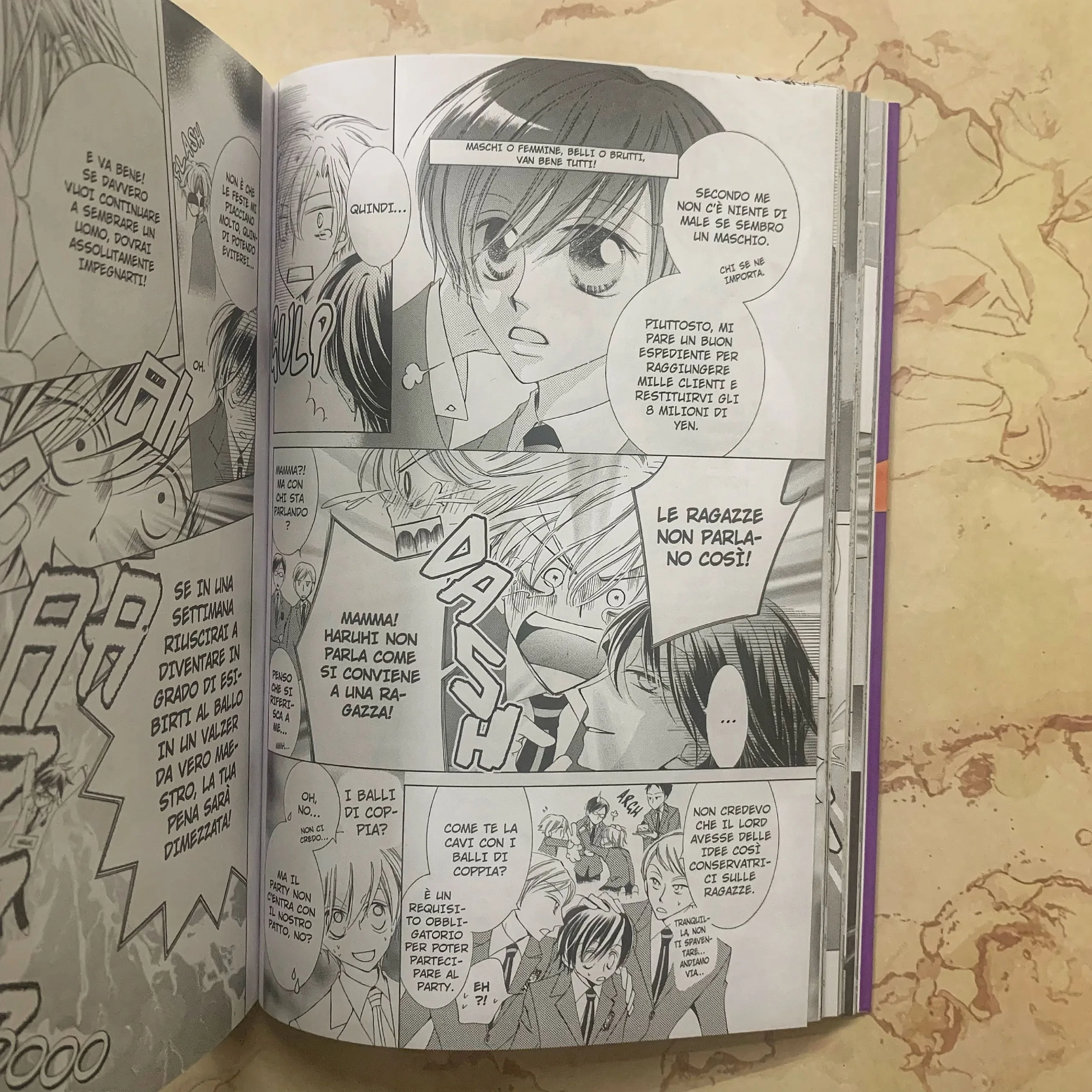 Al club si è recentemente aggiunto un nuovo membro, suo malgrado. Haruhi in realtà è una ragazza che bada poco al suo aspetto fisico e abbigliamento e per questo viene confusa con un ragazzo. Rompendo un prezioso vaso, contrae un debito con l’host club e quindi si trova a lavorare al fianco di questo stravagante gruppetto nascondendo il suo genere. E in entrambe le sue vesti e con la sua spontaneità “popolana” che ignora il denaro e il lusso, Haruhi conquisterà volente, ma soprattutto nolente, molti cuori, anche quelli del lettore.