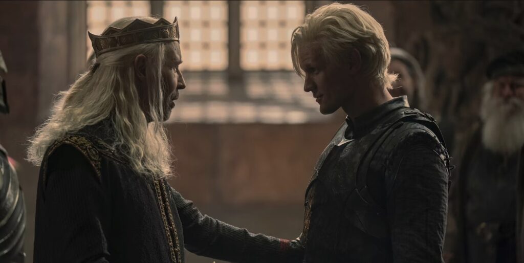 Viserys è furioso quando sente la reazione insensibile di Daemon alla morte di Baelon. Il Re disereda prontamente il Principe, affermando che preferisce “celebrare la propria ascesa” piuttosto che offrire il suo sostegno emotivo. Per tutta risposta, Daemon fa un enorme capriccio e fugge a Roccia del Drago.