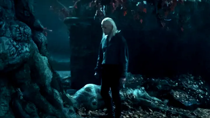 Il cavaliere vede la versione di Milly Alcock di Rhaenyra che ricuce la testa di Jaehaerys II sul suo corpo. Daemon si ricorda delle atrocità che ha contribuito a commettere durante la guerra civile Targaryen. Tuttavia, una volta terminata la visione, Daemon non si trovava più nelle stanze del suo letto, ma nel Bosco degli Dei di Harrenhal.