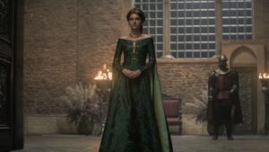 Uno dei motivi principali per cui il vestito di Alicent ha fatto così scalpore è che la sua Casa (Hightower) ha usato questo colore come una chiamata alle armi. In cima alla torre che ha dato il nome agli Hightower c’è un faro e quando gli Hightower chiamano i loro vessilli alla guerra, il faro si illumina di verde. Alicent dichiara guerra alla Casa Targaryen e ai suoi alleati.
