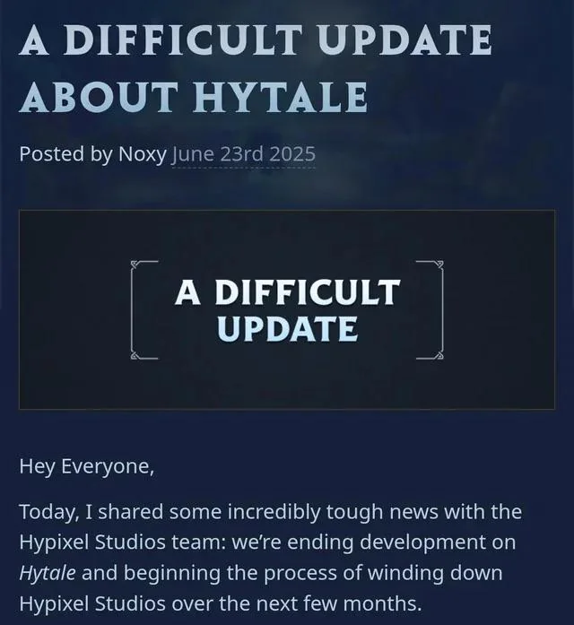 La finestra di lancio del 2021 scomparve lentamente e non venne più sostituita da un’altra. Nel frattempo l’ambizione cresceva, ma il gioco no. Quella spirale, che sembrava all’inizio una progressione naturale, divenne un vortice incontrollabile. Nel giugno del 2025 arrivò l’annuncio che molti temevano e che pochi osavano prevedere apertamente. Hytale veniva cancellato.