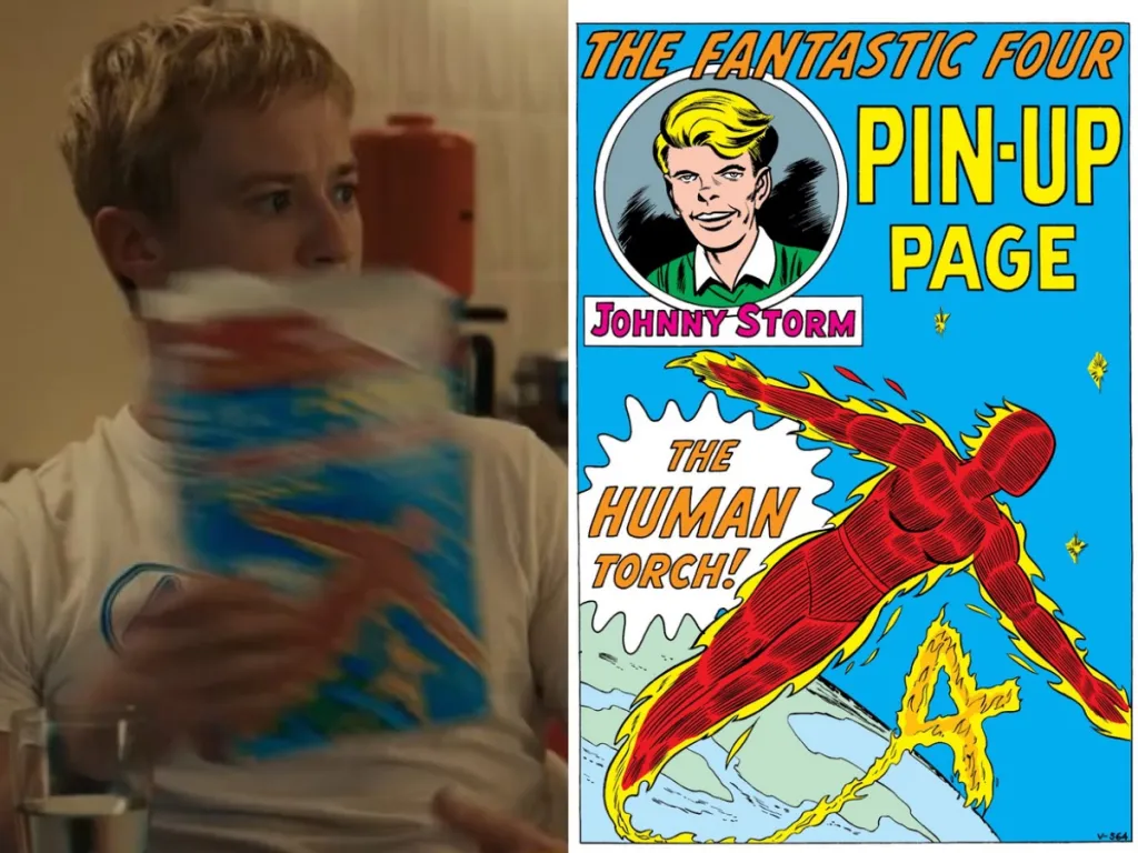 Nella clip di quattro secondi postata qui sotto, Johnny Storm (Joseph Quinn) sta gustando una ciotola di cereali Lucky Charms all’ora di cena. Sul fronte della scatola, accurata e d’epoca, c’è la mascotte L.C. the Leprechaun (che ha debuttato nel 1964). Sul retro della scatola: lui stesso fiammeggiante come Torcia Umana, tratto dalla pin-up di Kirby in Fantastic Four #3.