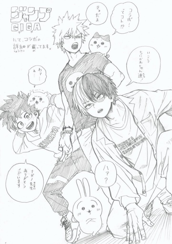 Tutti i giovani eroi sono attualmente nel mezzo della guerra finale contro i cattivi. Ci sono pochissime opportunità di vederli in uno stato più rilassato. Ciò è particolarmente vero per il trio principale: Izuku, Bakugo e Shoto. Ognuno di loro ha enormi pesi da sopportare prima che la serie si concluda. Fortunatamente, Horikoshi ha dato un nuovo look al trio, decisamente spensierato e sbarazzino, per celebrare una nuova collaborazione con l’ultimo numero della rivista Jump Giga di Shueisha.