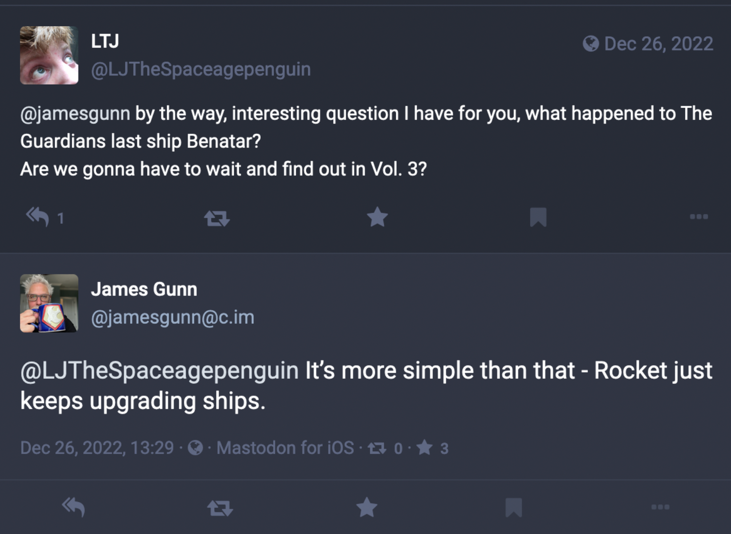 Il film del 2023 reintrodurrà le trame cosmiche della Marvel, il che significa che i Guardiani dovranno essere pronti a volare attraverso la galassia in qualsiasi momento. Per fortuna, hanno una nave nuova di zecca che sostituirà la loro precedente, la Benatar. Sebbene ci siano state notevoli speculazioni sul motivo per cui i Guardiani avrebbero sostituito la loro fidata nave, Gunn si è rivolto a Mastodon per chiarire la questione ai fan e per far sapere che Rocket Raccoon non è cambiato affatto. “È più semplice di così: Rocket continua ad aggiornare le navi”, ha risposto.