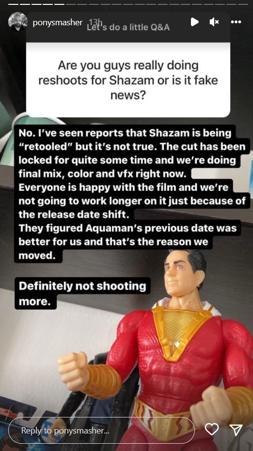 “No. Ho visto rapporti secondo cui Shazam sia stato ‘riorganizzato. Le riprese sono state bloccate per un po’ di tempo ma ora stiamo facendo il mix finale”, ha scritto il regista durante un Instagram Domande e risposte. “Tutti sono contenti del film e non lavoreremo più a lungo solo a causa dello spostamento della data di uscita. Hanno pensato che la data precedente di Aquaman fosse migliore per noi ed è per questo che ci siamo trasferiti. Sicuramente non per girare di più”.
