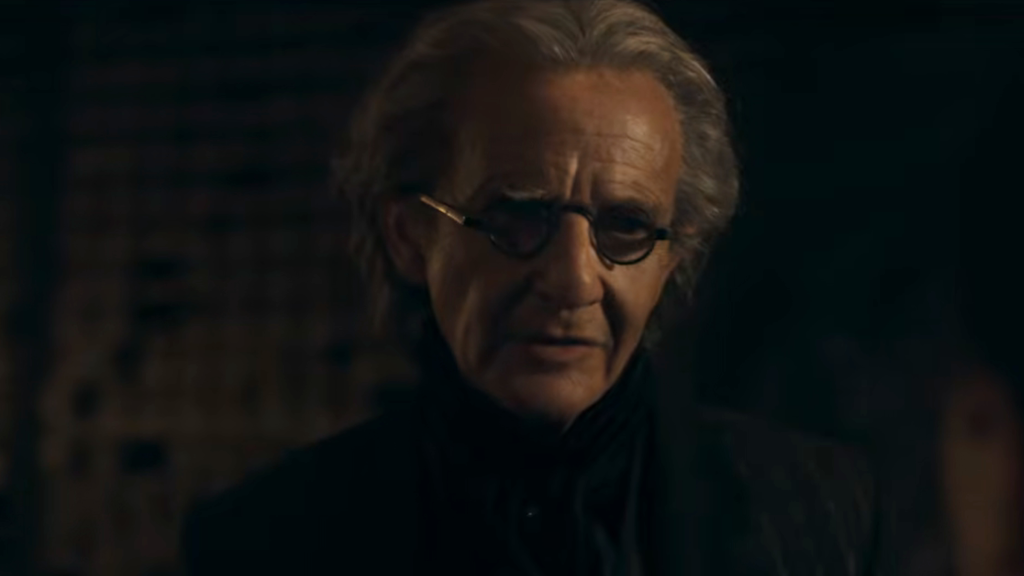Anton Lesser interpreta il creatore di bacchette Ollivander. La scena nel negozio appare cupa e suggestiva, sottolineando l’importanza del legame mistico tra Harry e il suo nuovo strumento magico.