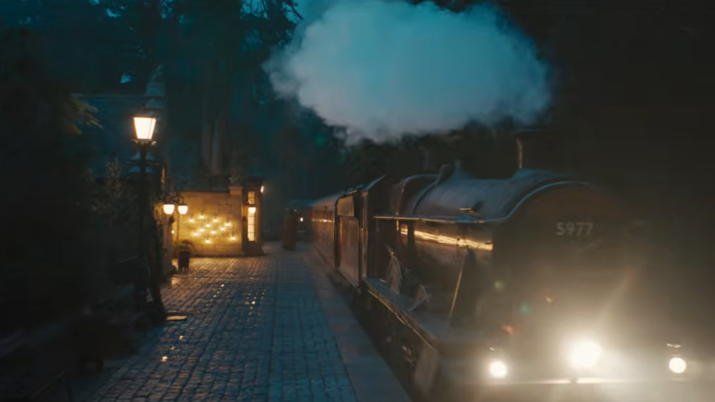 Rispettando la timeline del libro, l’Espresso di Hogwarts arriva a destinazione di notte. Le immagini della locomotiva a vapore catturano perfettamente l’atmosfera magica del viaggio verso la scuola di magia.