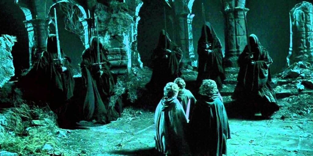 Ad Amon Sûl, nella Compagnia dell’Anello, Frodo e gli altri Hobbit devono difendersi dall’avvicinarsi dei Nazgûl. Frodo viene spinto a terra e indossa l’anello come ultima risorsa per difendersi. Questo gli permette di vedere l’orribile spettacolo delle apparizioni spettrali dei Nazgûl. A questo punto, il film aveva già mostrato le conseguenze negative dell’indossare l’anello e il modo in cui esso avrebbe legato Frodo a Sauron. Contro i Nazgûl, l’anello non può aiutare Frodo e finisce per essere pugnalato.
